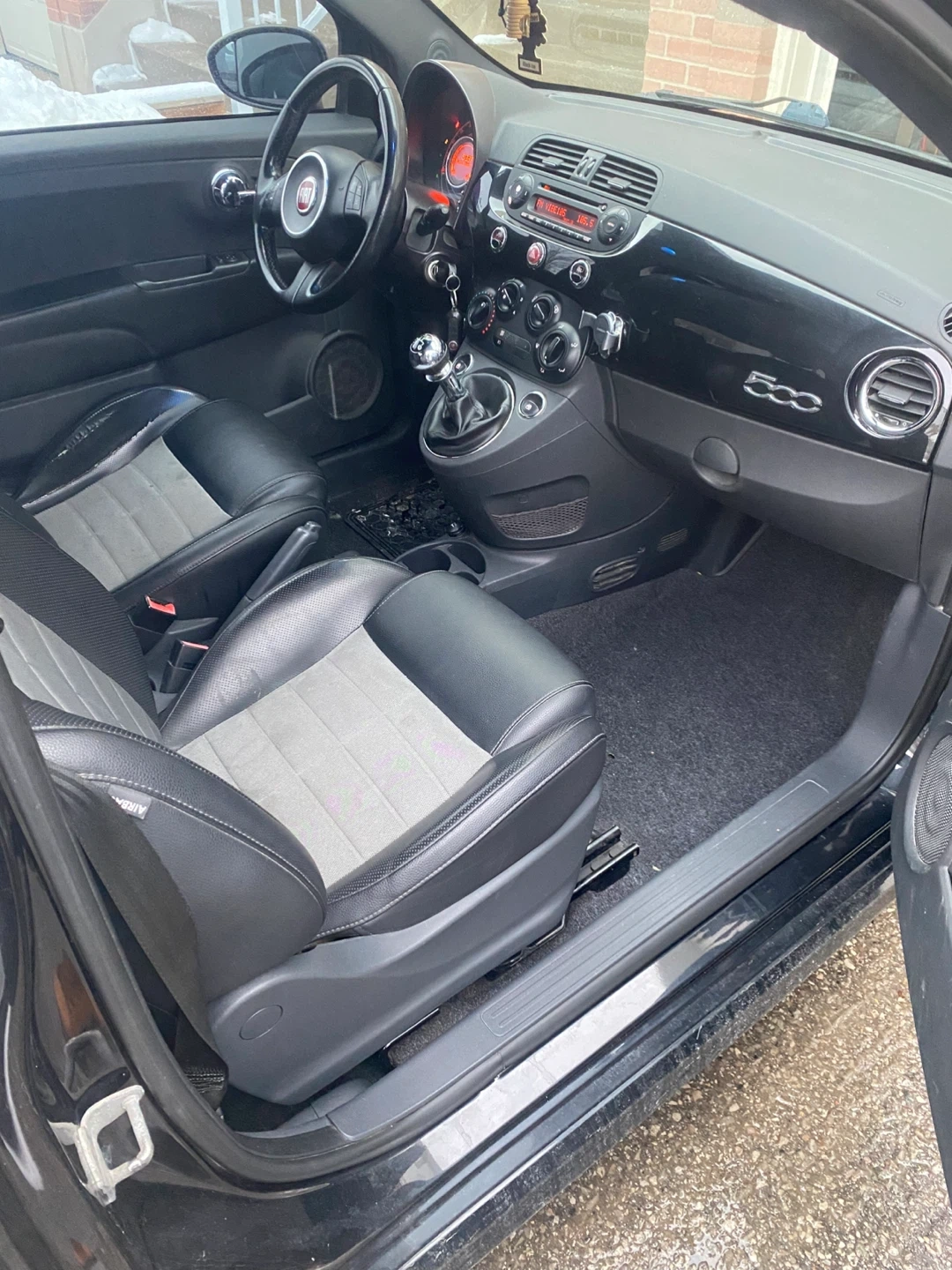 This is a black Fiat 500 with a two-tone interior. It features a manual transmission and stylish alloy wheels. Perfect for zipping around town! 203,000 km.