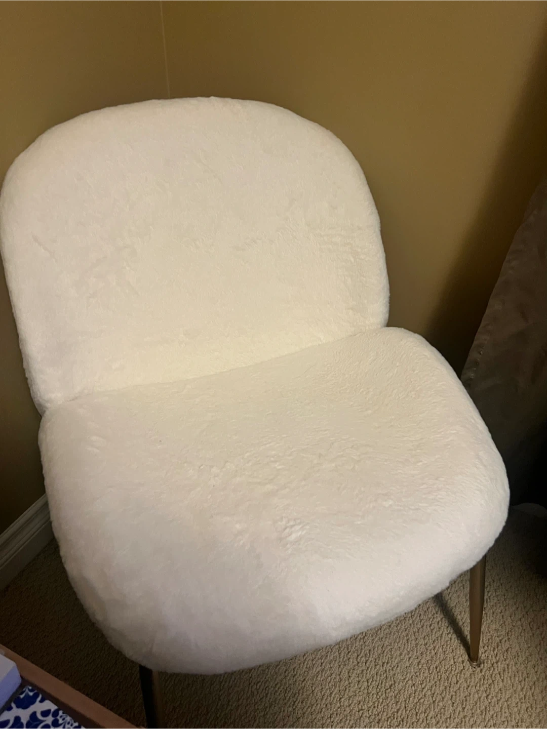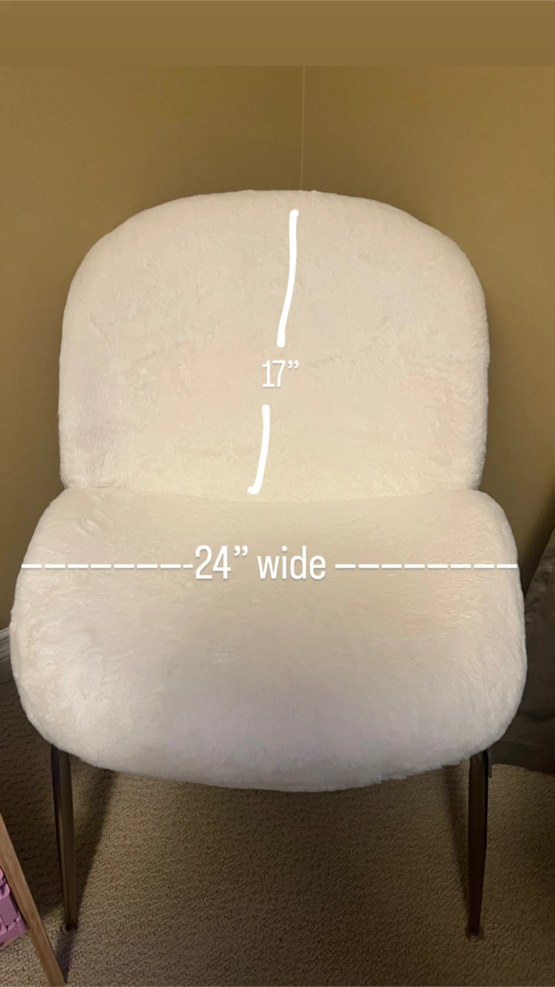 Comfy accent chair with a fluffy cream sherpa/brushed fur upholstery from Structube. It's 24” wide, 17” high from the seat, 27” tall from the very bottom.