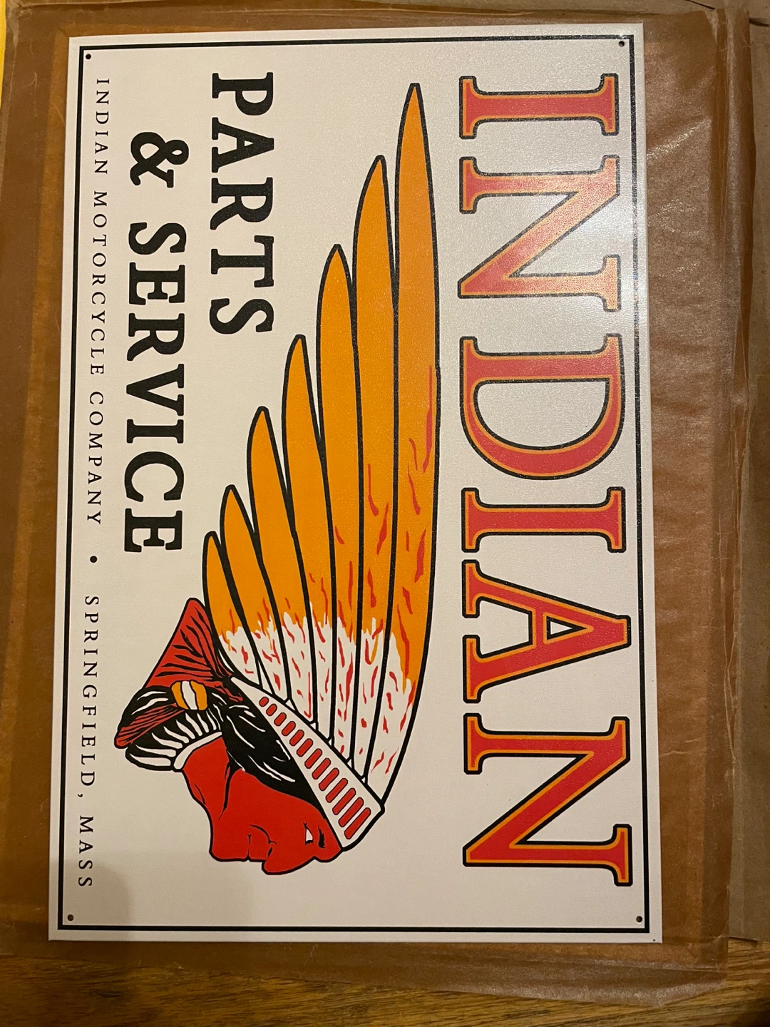 Selling an Indian Motorcycle Parts & Service sign. It features the iconic Indian head logo and is made in the U.S.A. It's a great piece for any motorcycle enthusiast or collector