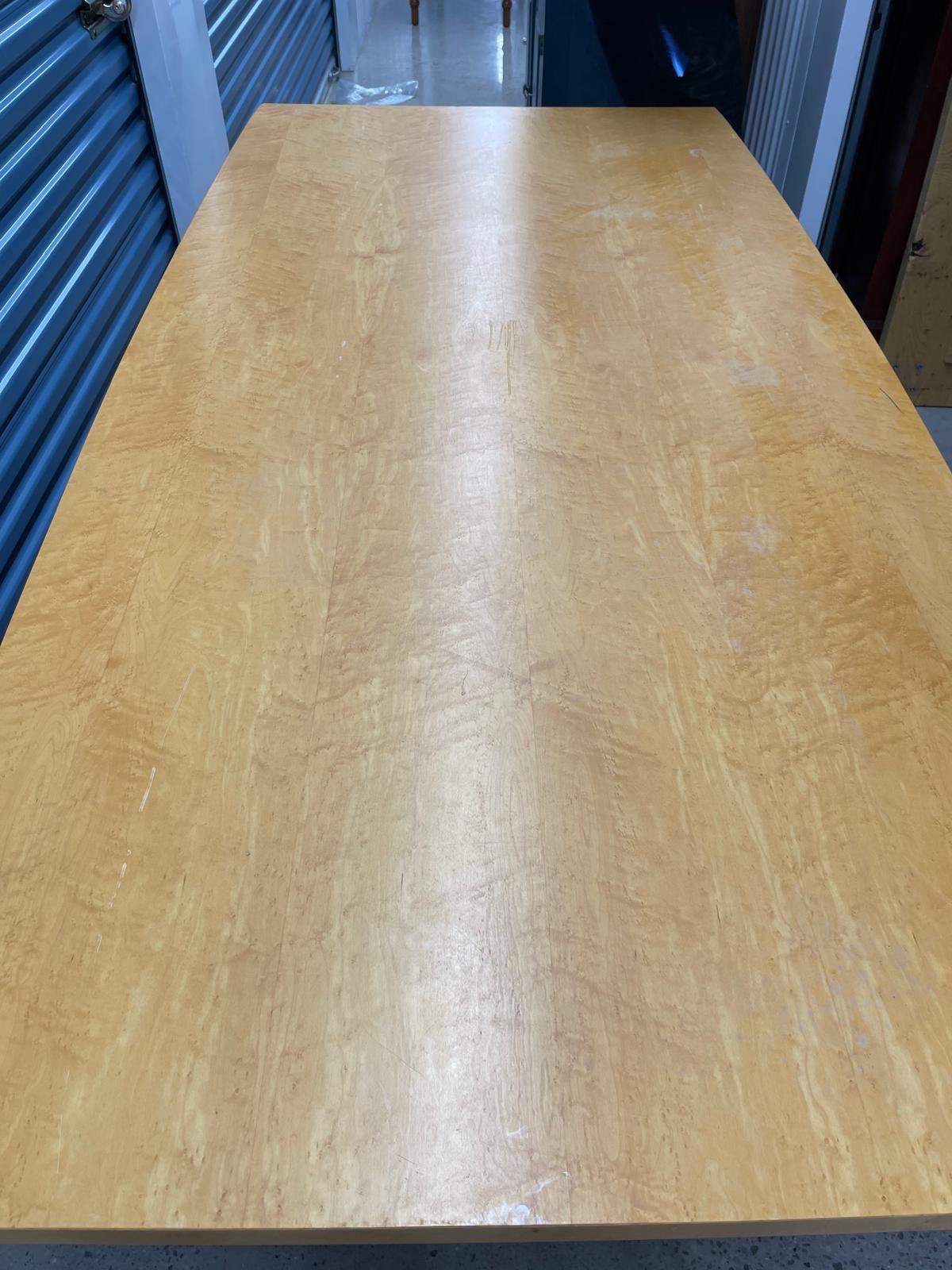 Large rectangular dining table featuring a light wood veneer top with bookmatched grain. Generous proportions comfortably seat 6–8 people. Clean, modern profile that works well in contemporary or transitional dining spaces.