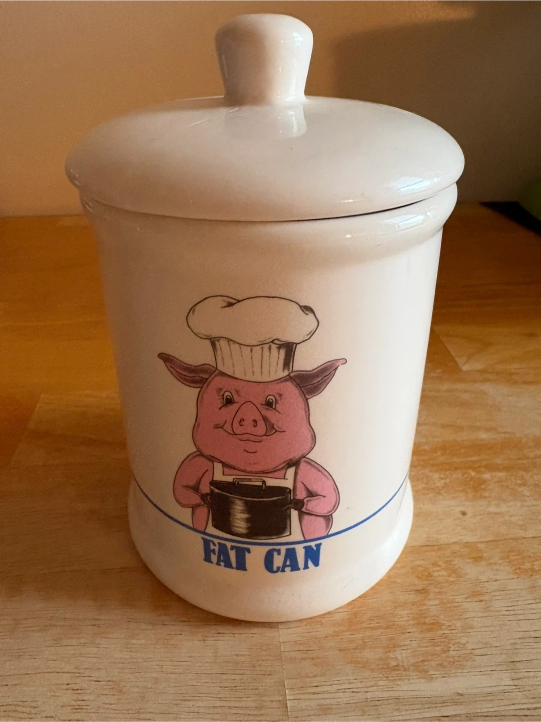 Selling a cute vintage ceramic container labeled "Fat Can" with a pig design. It's in good condition and ready to add some charm to your kitchen!