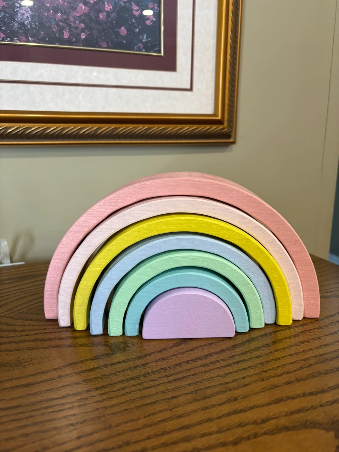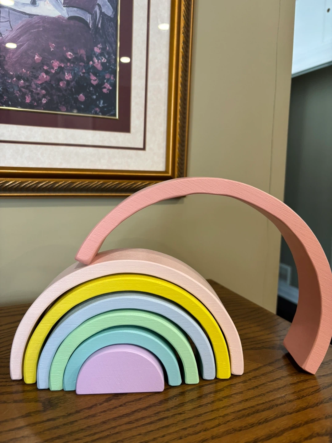 This is a cute wooden rainbow stacking toy in brand new condition! Comes in a box. Perfect for gifting. It features several pastel colours. Perfect for kids!