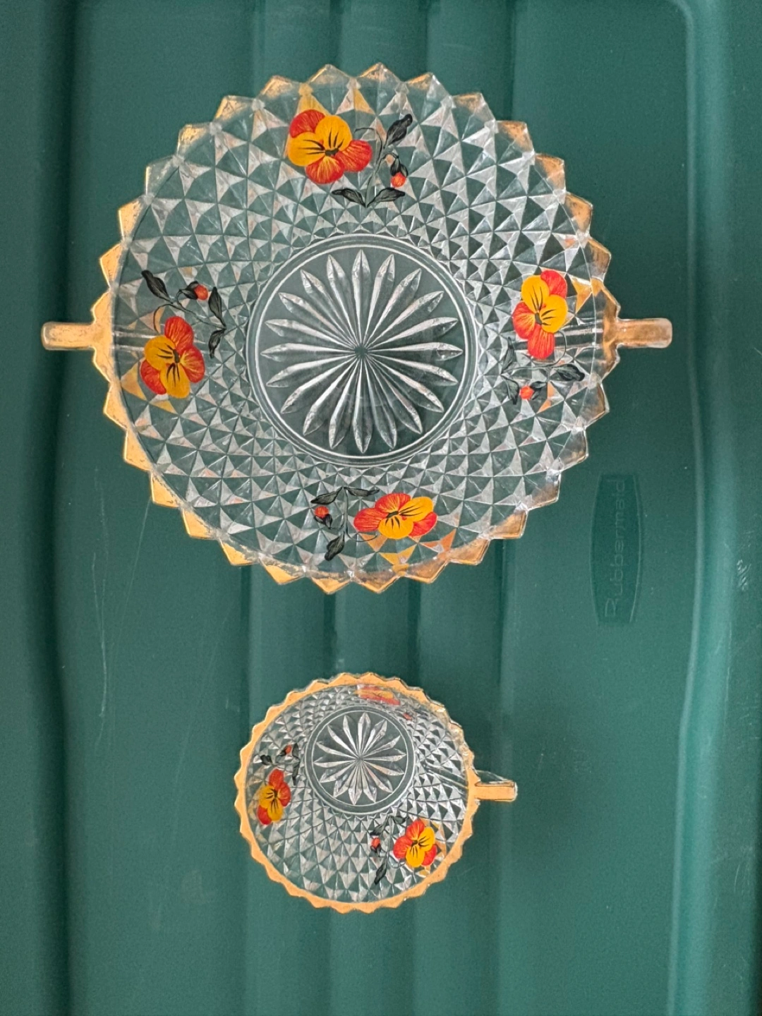 Here's a charming vintage glass bowl and cup set! The pieces feature a lovely floral design with orange and yellow flowers, perfect for adding a touch of retro elegance to your home