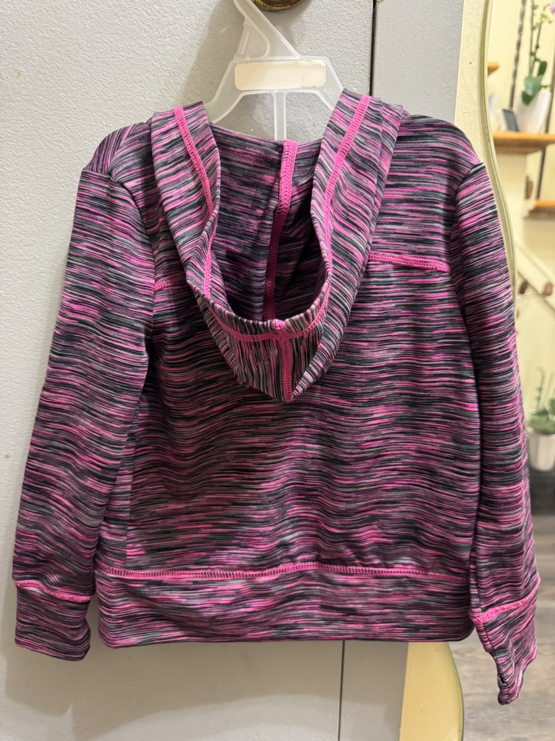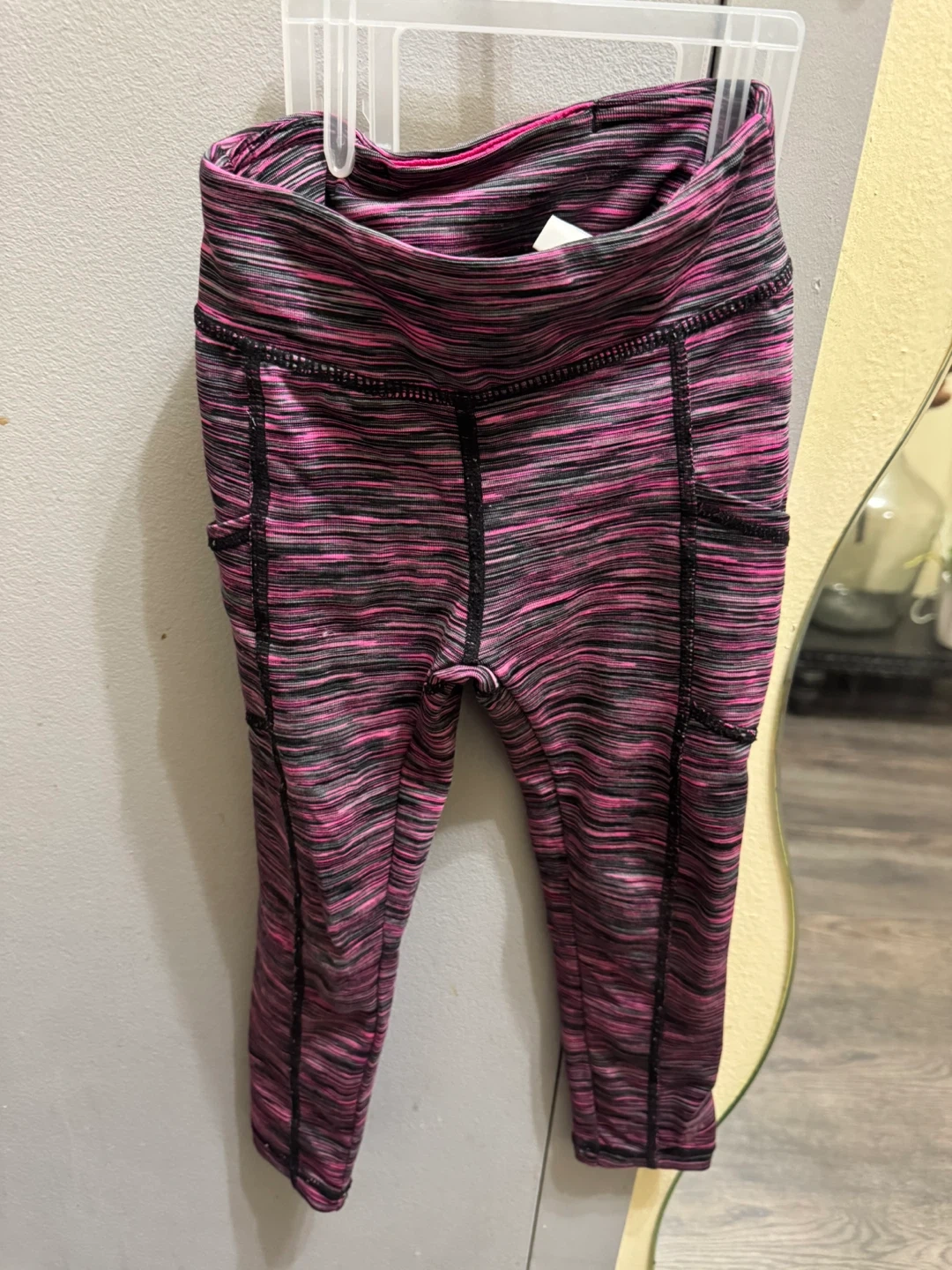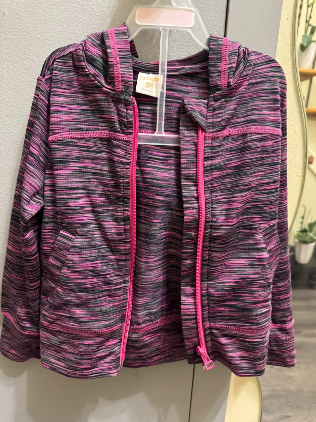 This Gymgo tracksuit set includes a zip-up jacket XXS (2T) and leggings XS (4) . It's made from a polyester and spandex blend.