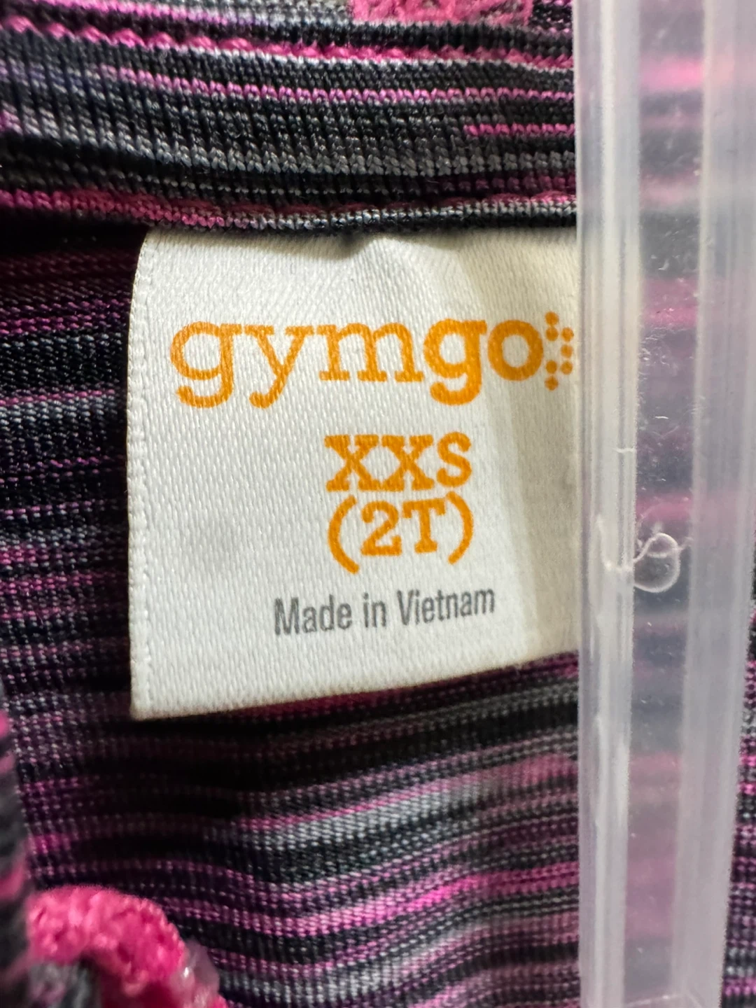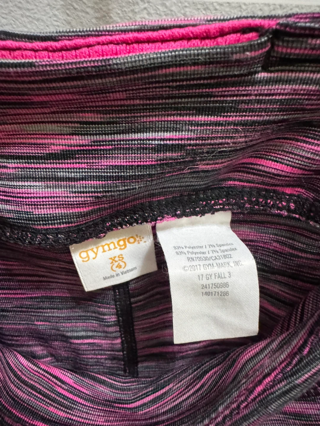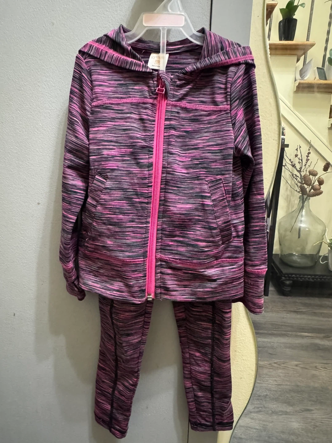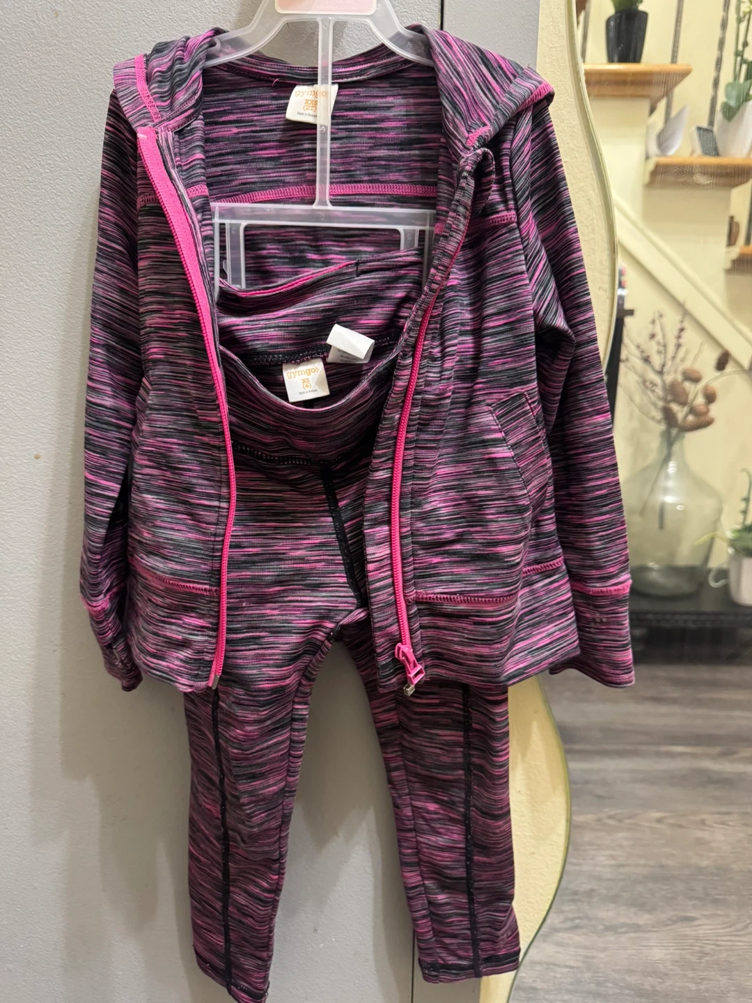 This Gymgo tracksuit set includes a zip-up jacket XXS (2T) and leggings XS (4) . It's made from a polyester and spandex blend.