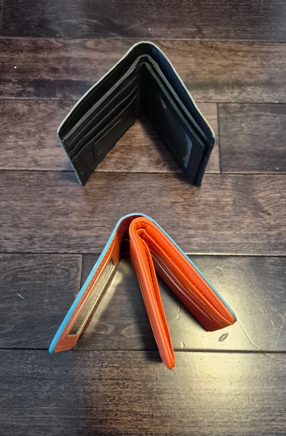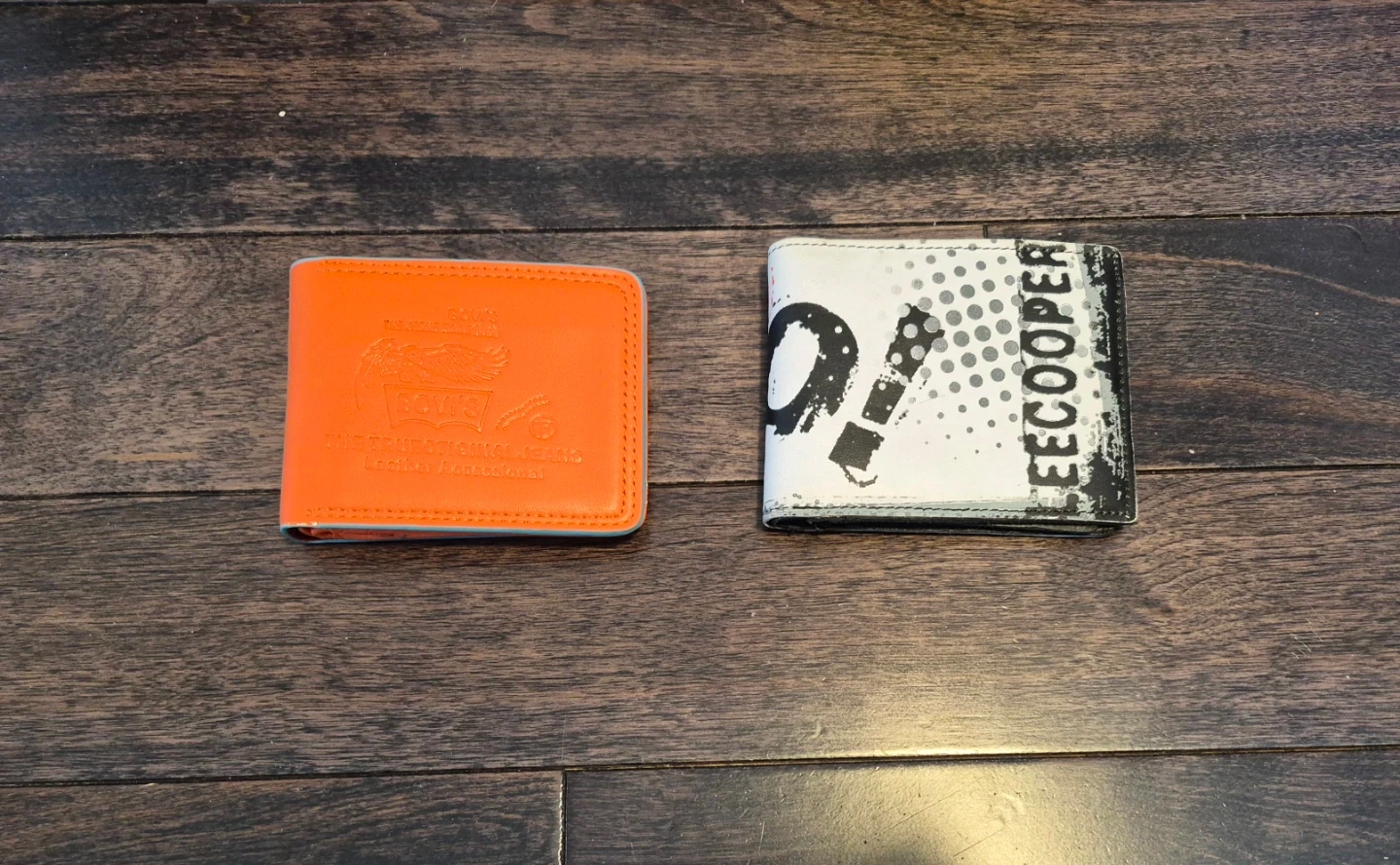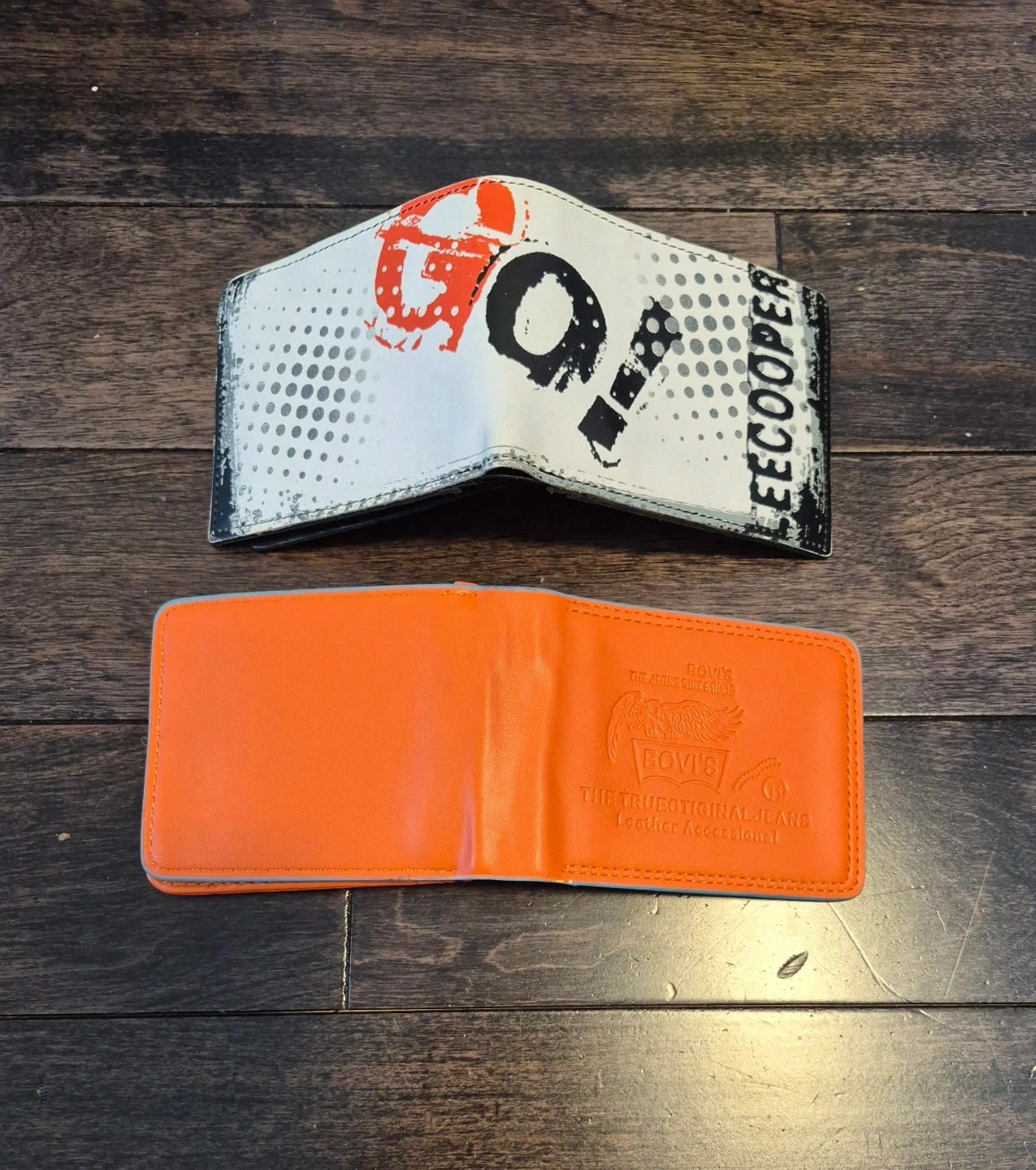 Orange leather Bovi's wallet with "The Original Jeans" embossed print. Includes a black and white graphic print Lee Cooper wallet.