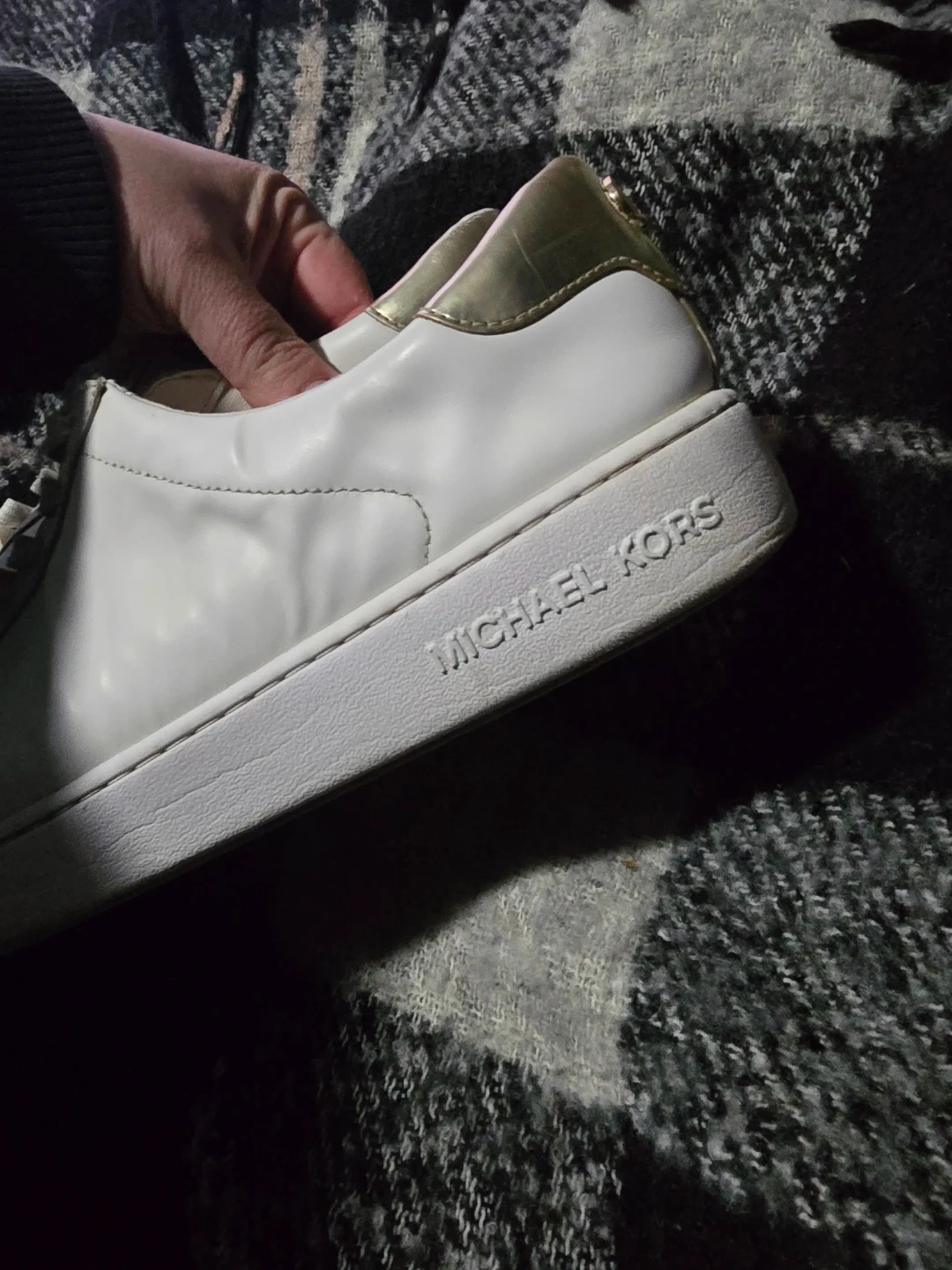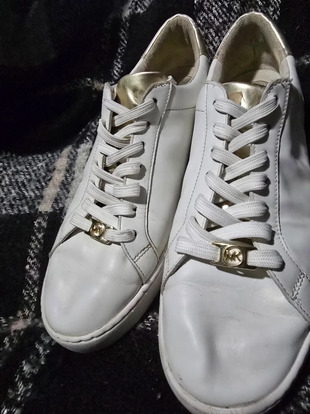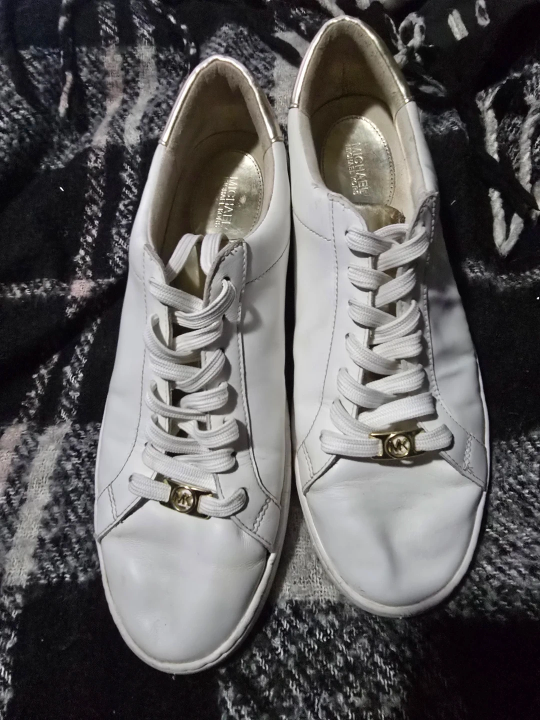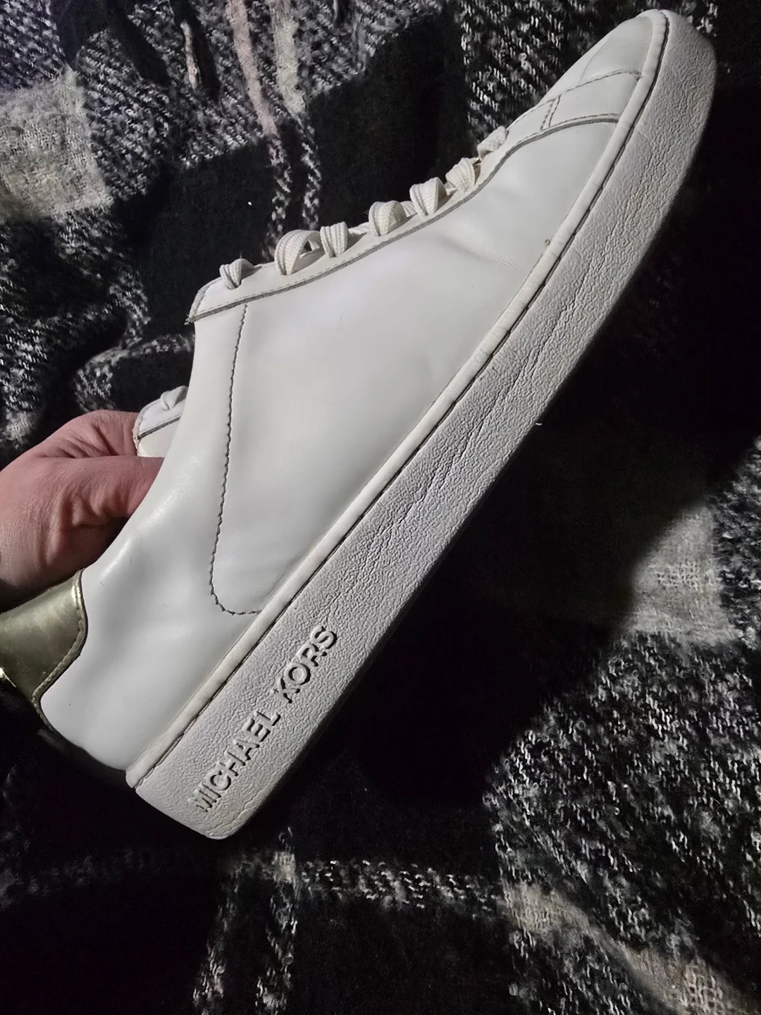 These Michael Kors sneakers are white with gold accents. They're made of leather and feature the Michael Kors logo on the side. Classic lace-up style. Size 11