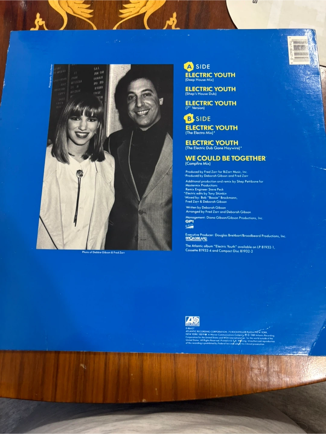 This is Debbie Gibson's 'Electric Youth' vinyl record. It features songs like "Electric Youth" and "We Could Be Together". Manufactured by Atlantic Recording Corporation in 1989. This is a great addition for any 80s music collector!