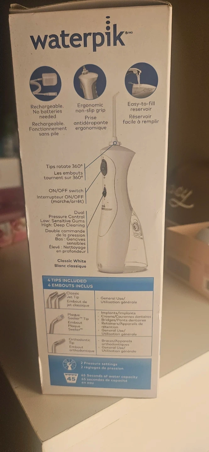 Waterpik cordless water flosser, comes with 4 tips and 2 pressure settings. It has a 45-second water capacity and is rechargeable. Ergonomic non-slip grip and easy-to-fill reservoir.