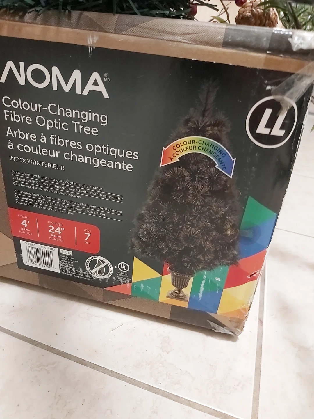 Selling a NOMA Colour-Changing Fibre Optic Tree! It's 4ft tall and has a 24" diameter. It features multi-coloured bulbs that continuously change colour, and 13 layers with 82 branch tips decorated with champagne glitter.