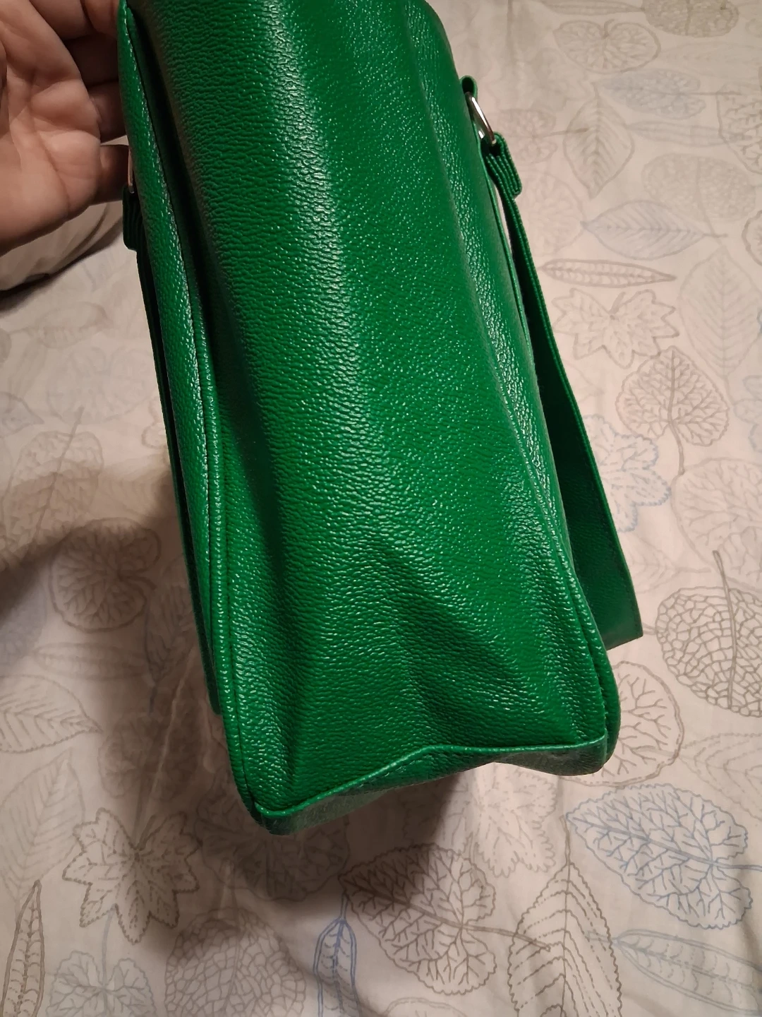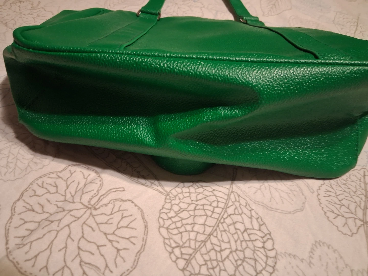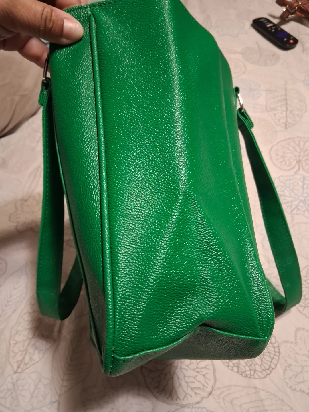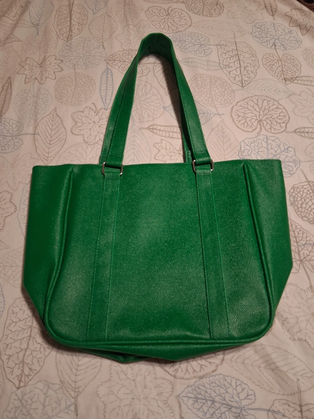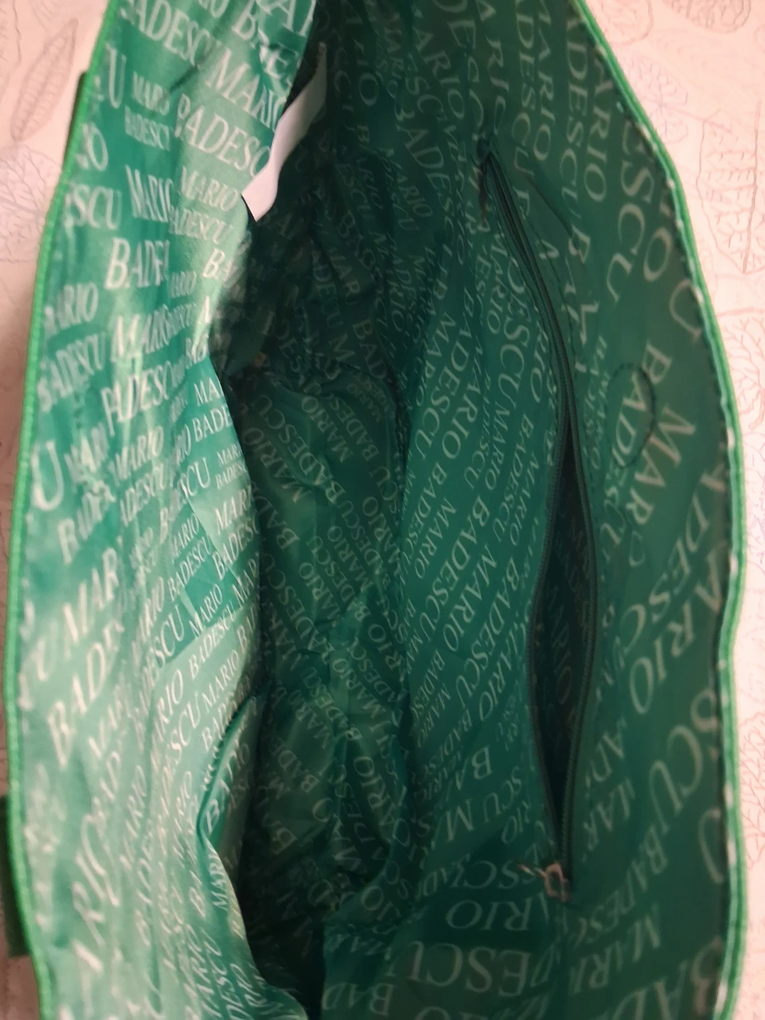 This is a green tote bag from Mario Badescu. It's made of faux leather and has the brand name printed on the inside lining. Features a spacious main compartment with a zip pocket.