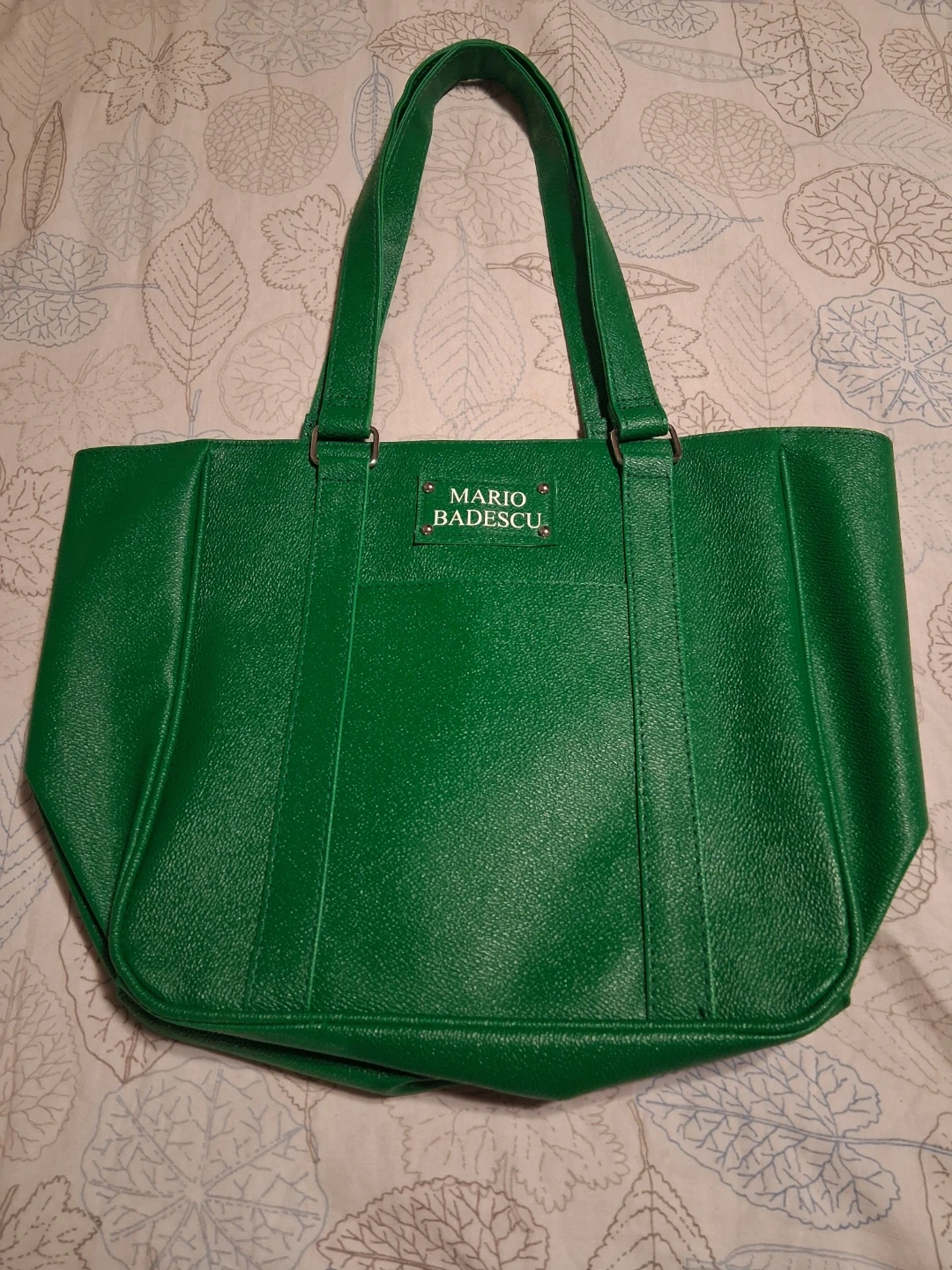 This is a green tote bag from Mario Badescu. It's made of faux leather and has the brand name printed on the inside lining. Features a spacious main compartment with a zip pocket.