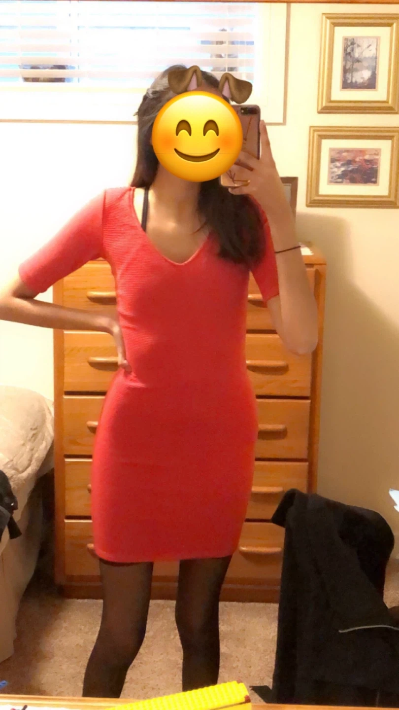 This is a vibrant red mini dress with short sleeves and a flattering V-neckline. It's made of a textured fabric that offers a nice stretch for comfort. This dress is perfect for a night out or a casual event!