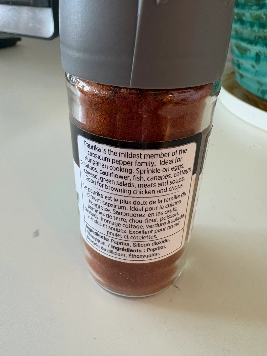 This is McCormick Gourmet Paprika. It's the mildest member of the capsicum pepper family. Use it for Hungarian cooking, sprinkling on eggs, potatoes, cauliflower, fish, or in canapés, cottage cheese, and green salads.