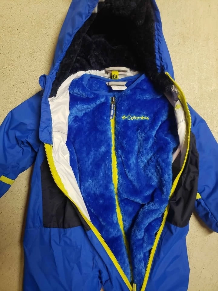 *CAR SEAT SAFE* Columbia Shark Trek Interchange Bunting one piece winter snowsuit. bright blue & navy with yellow asymmetrical zip for easy on, easy off.