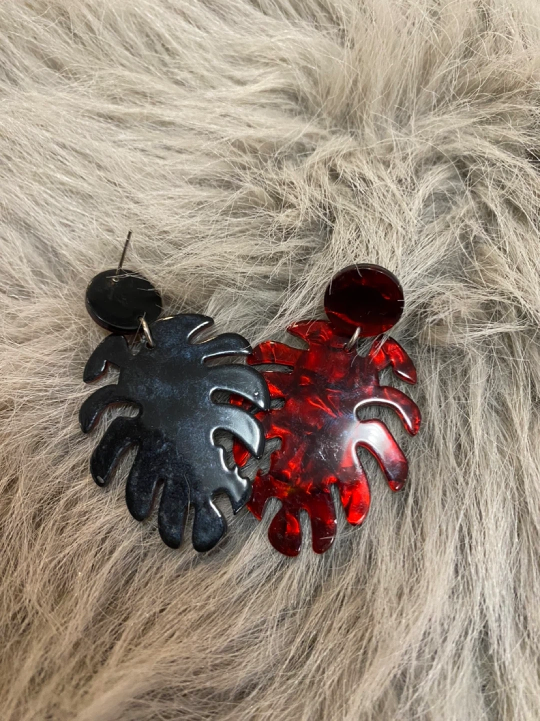 These fun leaf-shaped dangle earrings come in a striking red marbled pattern. They're lightweight and add a pop of colour to any outfit. Perfect for someone who loves nature-inspired accessories!