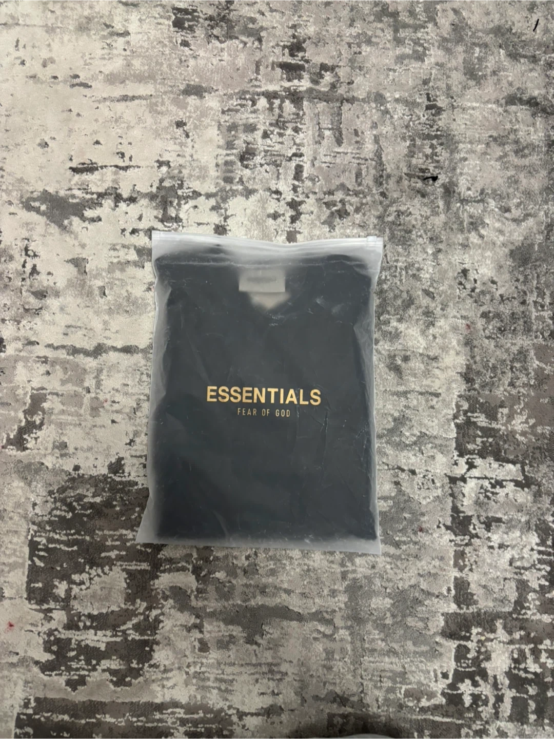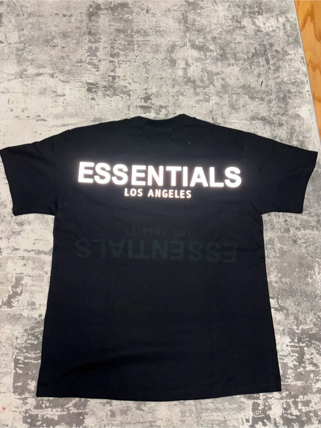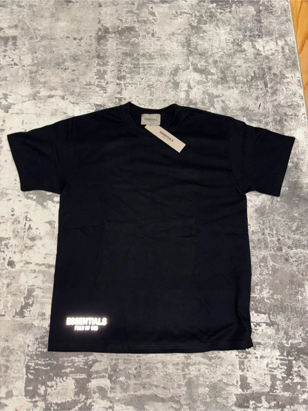 This is a black t-shirt from Fear of God Essentials. It features reflective 'ESSENTIALS' branding on the back and a smaller logo on the front hem. This shirt is made from a comfortable fabric.