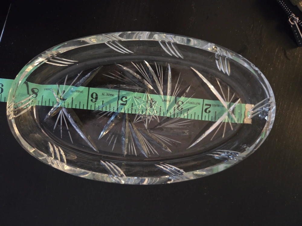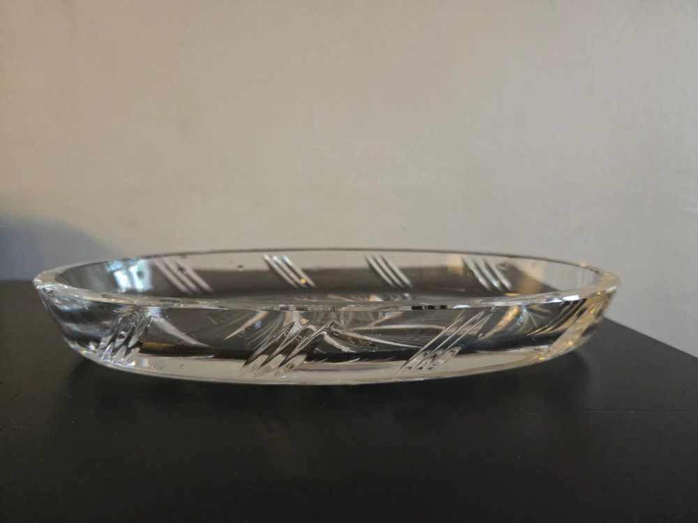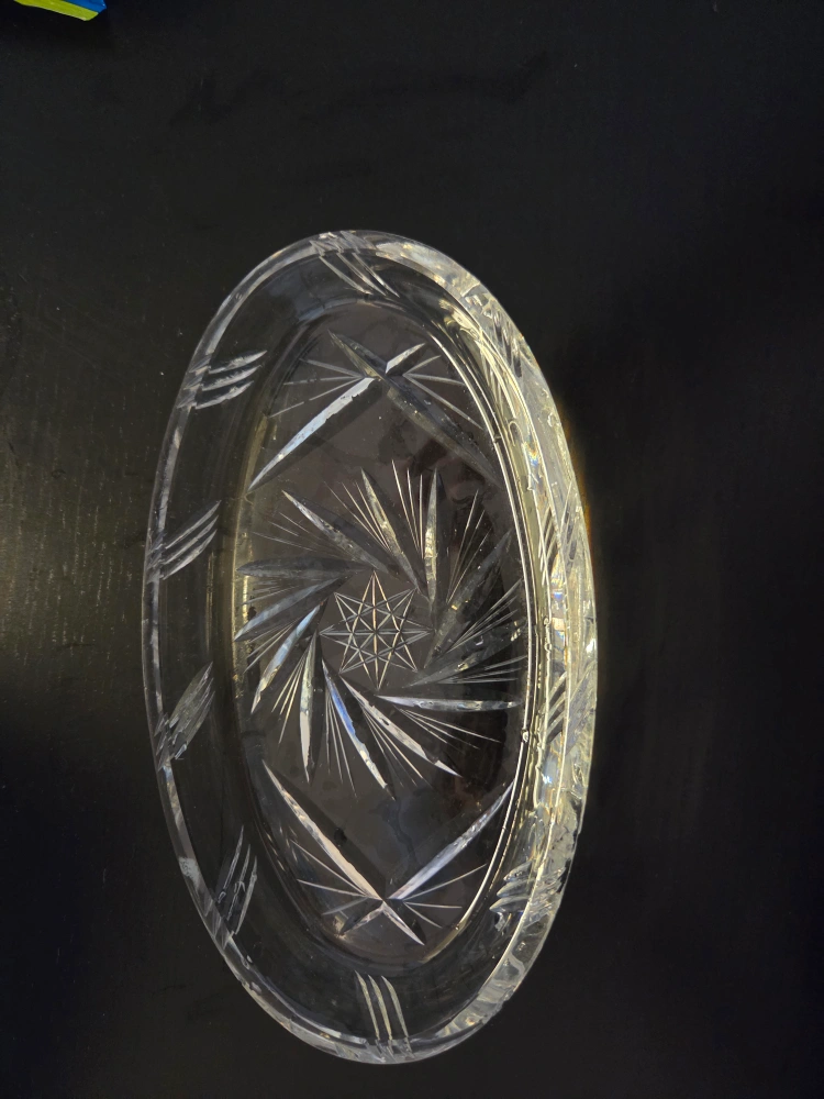 Selling a beautiful crystal glass oval serving dish! It measures approximately 8 inches in length 1" in depth 4 1/2 in width. The dish features a lovely starburst pattern. Perfect for serving appetizers or desserts!