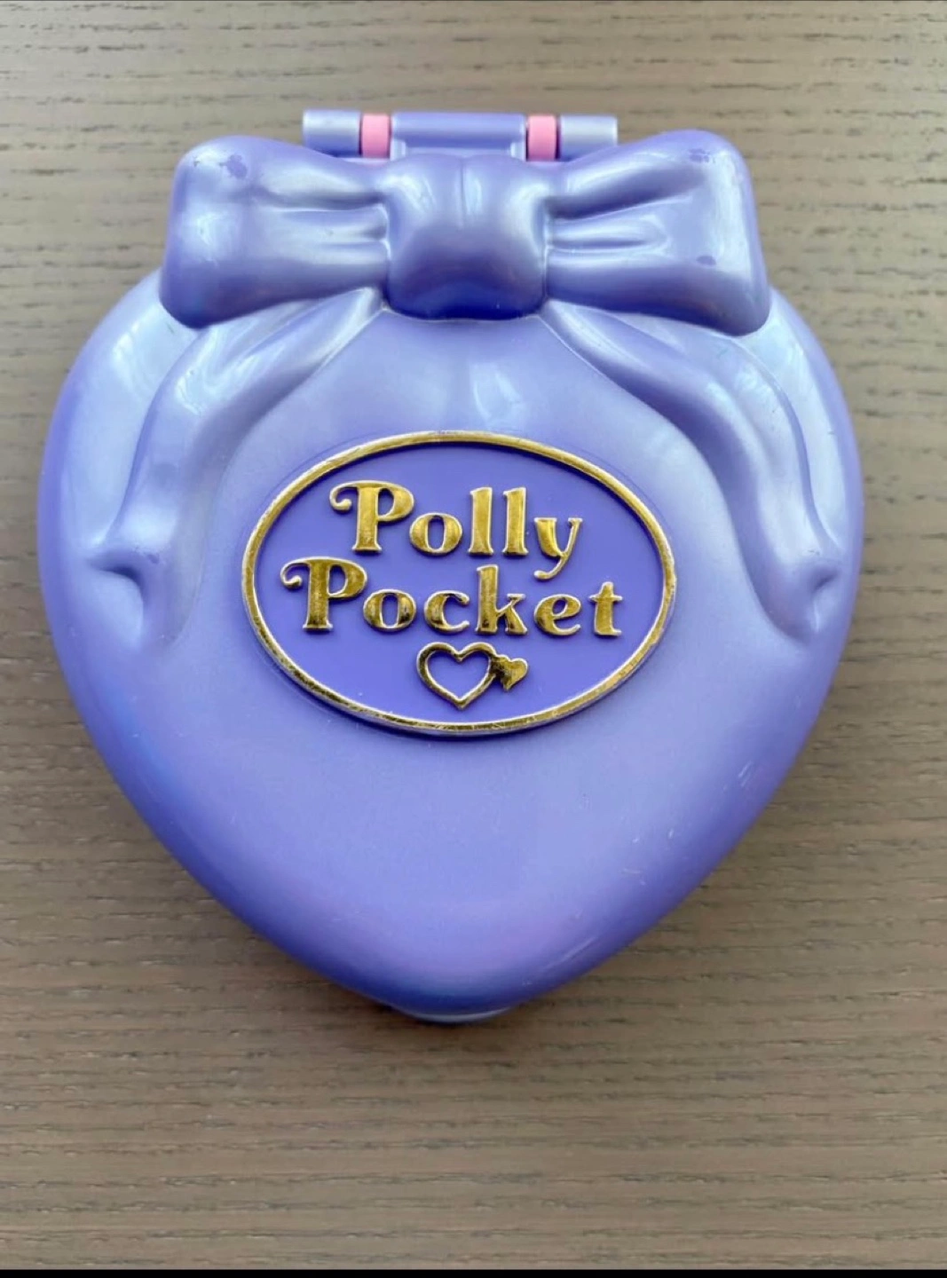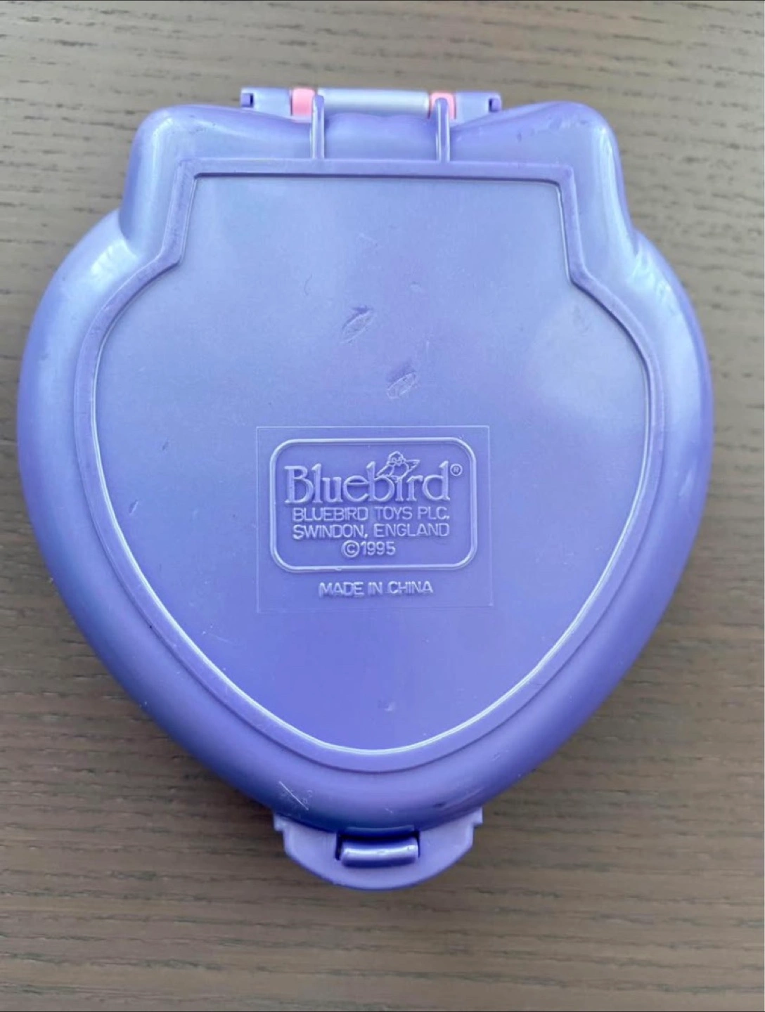 This is a vintage Polly Pocket compact made by Bluebird Toys in 1995. It features a heart-shaped design and opens to reveal a detailed miniature playset. The compact is purple with a pink bow accent.