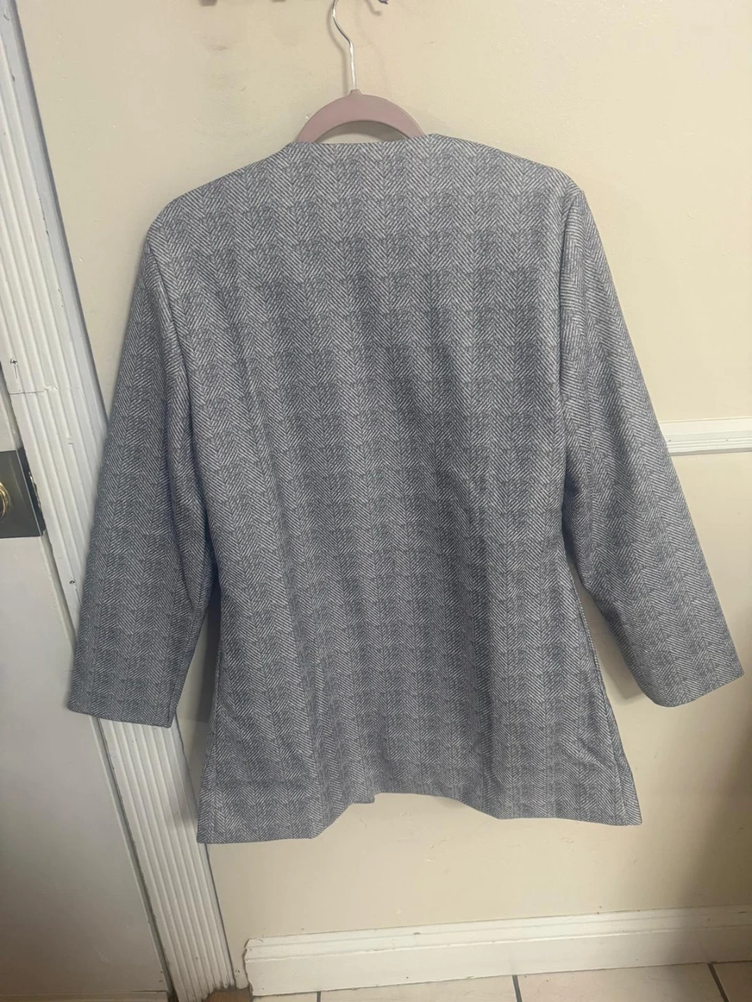 Selling a stylish blazer with a gray herringbone pattern. It's perfect for adding a touch of sophistication to any outfit!