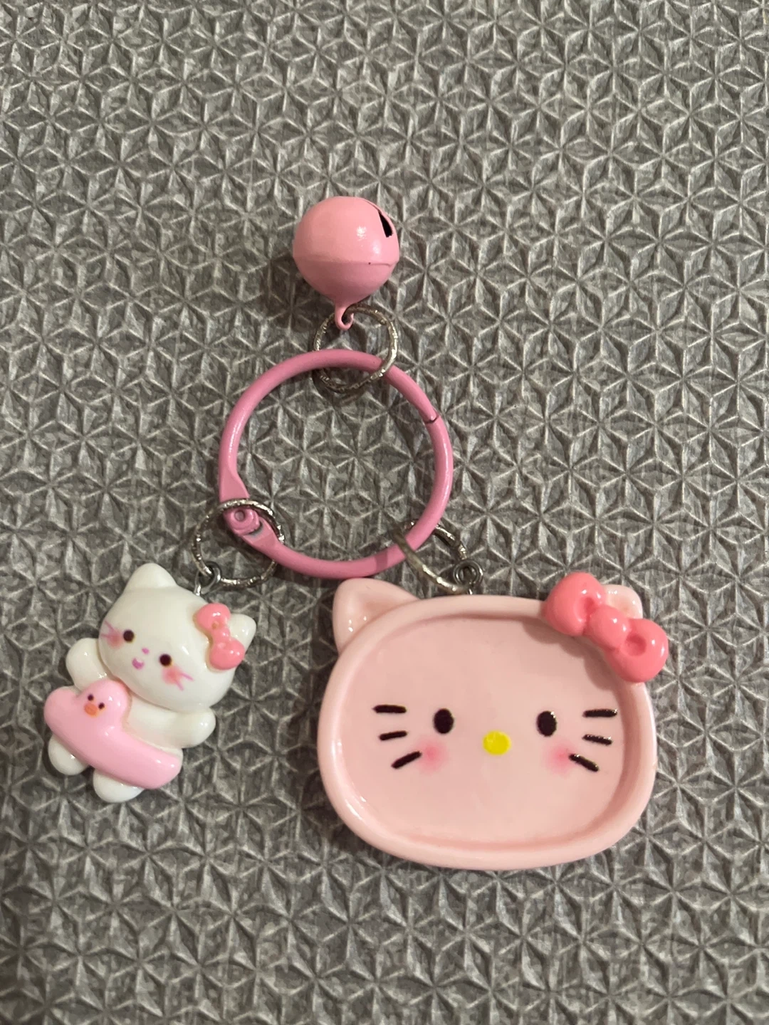 This is a cute pink Hello Kitty keychain. It includes a Hello Kitty charm with a pink bow, a bell, and a ring for attaching to bags or keys.