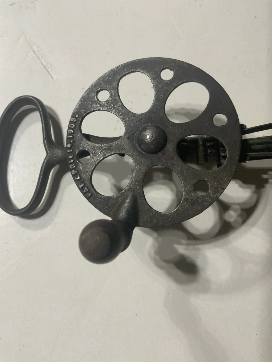 This is a vintage hand-crank egg beater. It has a metal construction with a wooden handle. Patent date stamped on the side reads 1903.