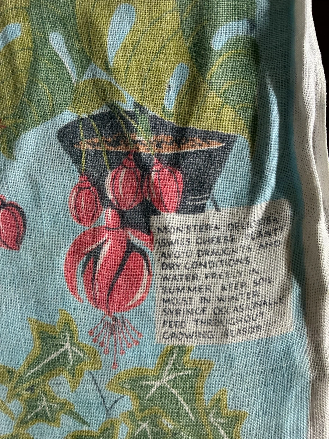 $5 Vintage iris linen tea towel 1960s 1970s oxfam peace indoor plants Donlands O'Connor