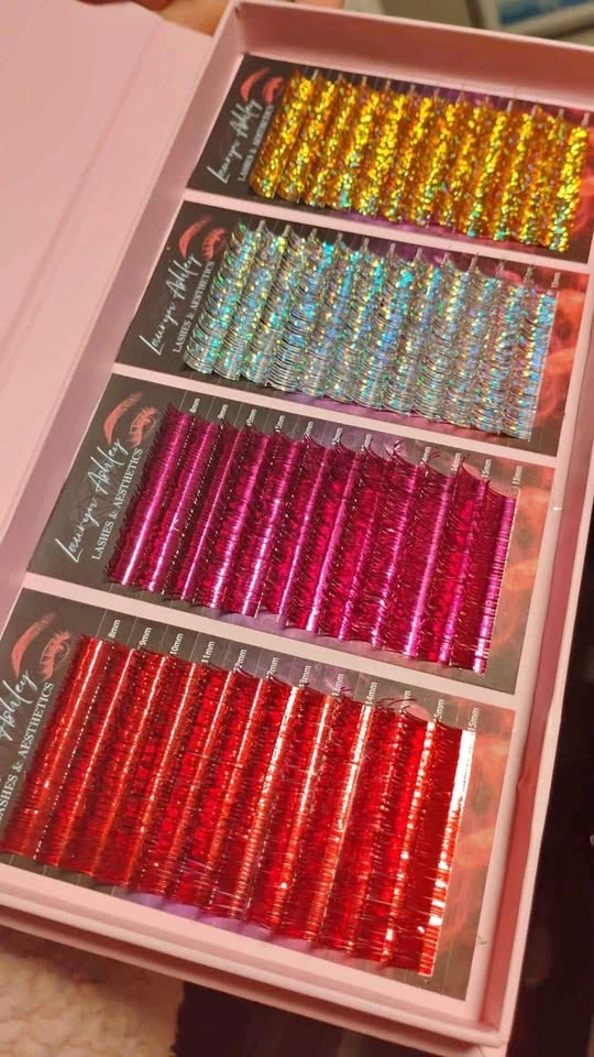 4 colours in 1 box, 8mm - 15mm. I've been using these myself and they hold for up to 4 months with proper application, causing no damage and no melting. They are easy to remove but hold strong. One box will last you 10x longer than single half tinsel trays. Each box contains Red, Magenta Pink, Holographic Silver, and Holographic Gold.