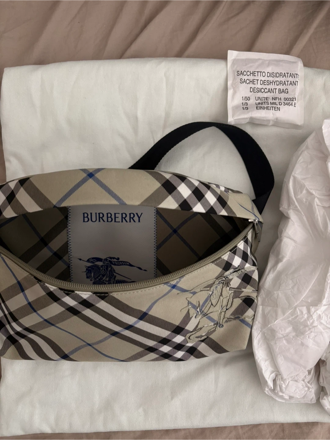 This is a Burberry bag in their signature Nova Check pattern. It features a zip closure and an adjustable strap. The bag comes with its original dust bag and authenticity tags.