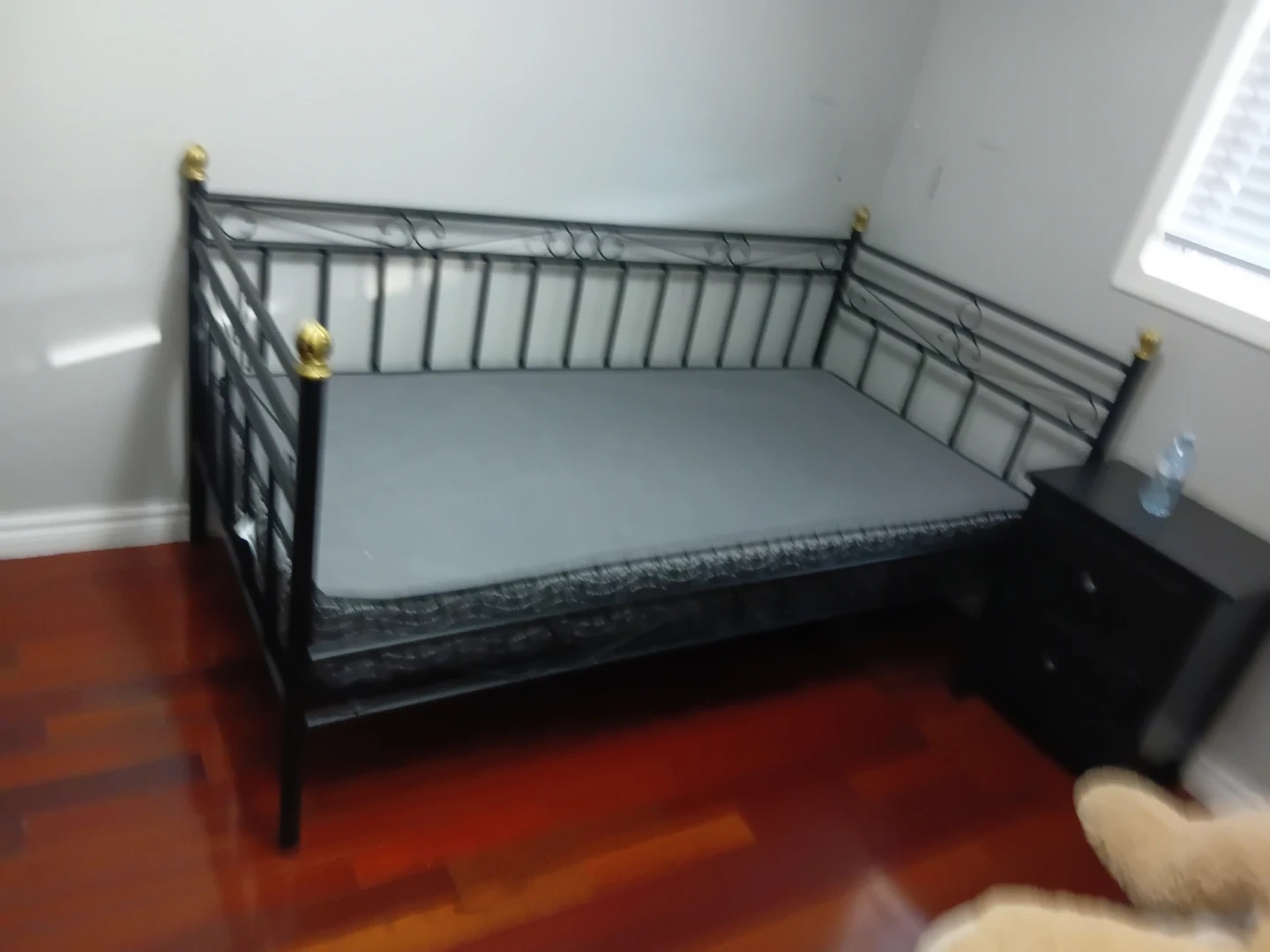 This is a black metal daybed frame with gold accents. It comes with a grey mattress. The frame has a slatted design and ornate detailing. It's great for a guest room or smaller living space.