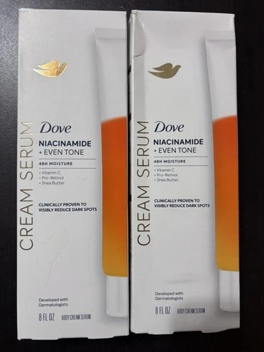 This Dove Body Cream Serum is a moisturizing lotion with Niacinamide to help achieve even tone skin. This 8oz pack includes two bottles of white-colored cream, perfect for daily skincare routines. It provides deep hydration and improves skin tone for a radiant complexion. Ideal for keeping your skin nourished and healthy.