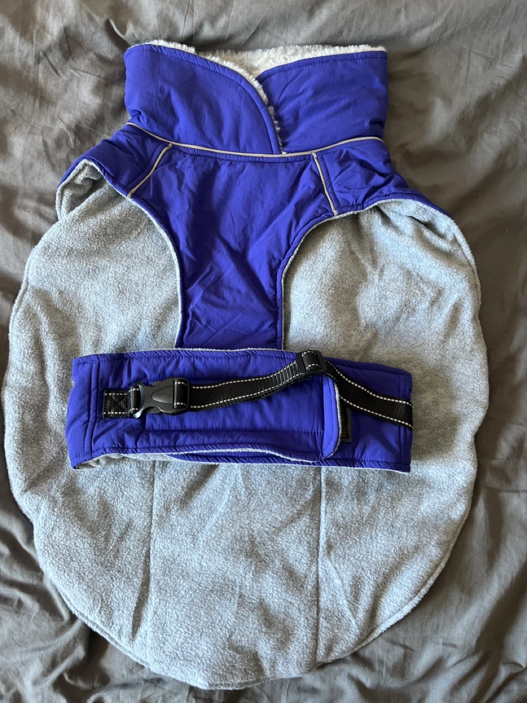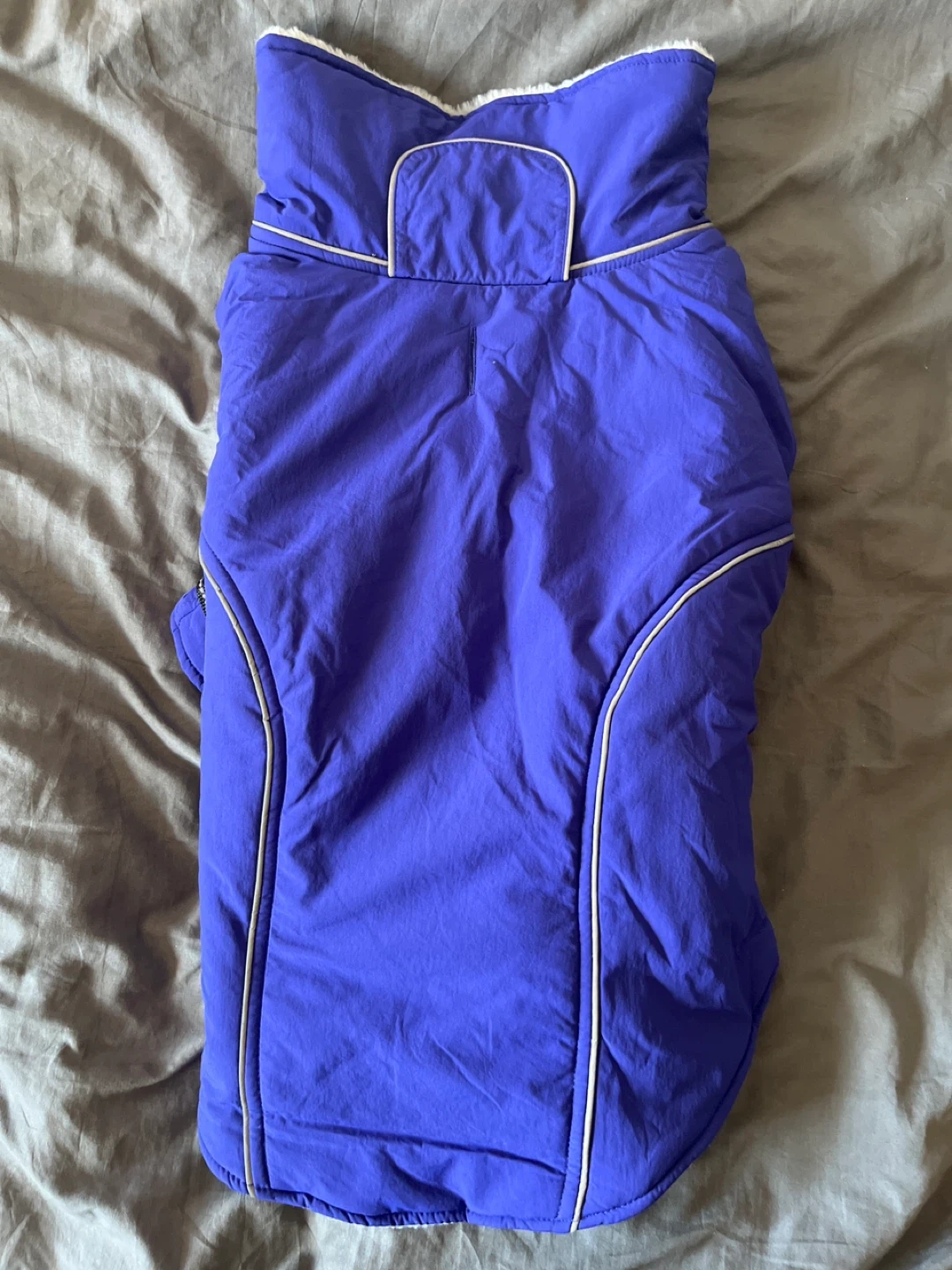 XL- This dog winter coat is purple on the outside and grey and white sherpa lined on the inside. It has a Velcro belly strap and a leash hole on the back. Keeps your furry friend warm on chilly days!