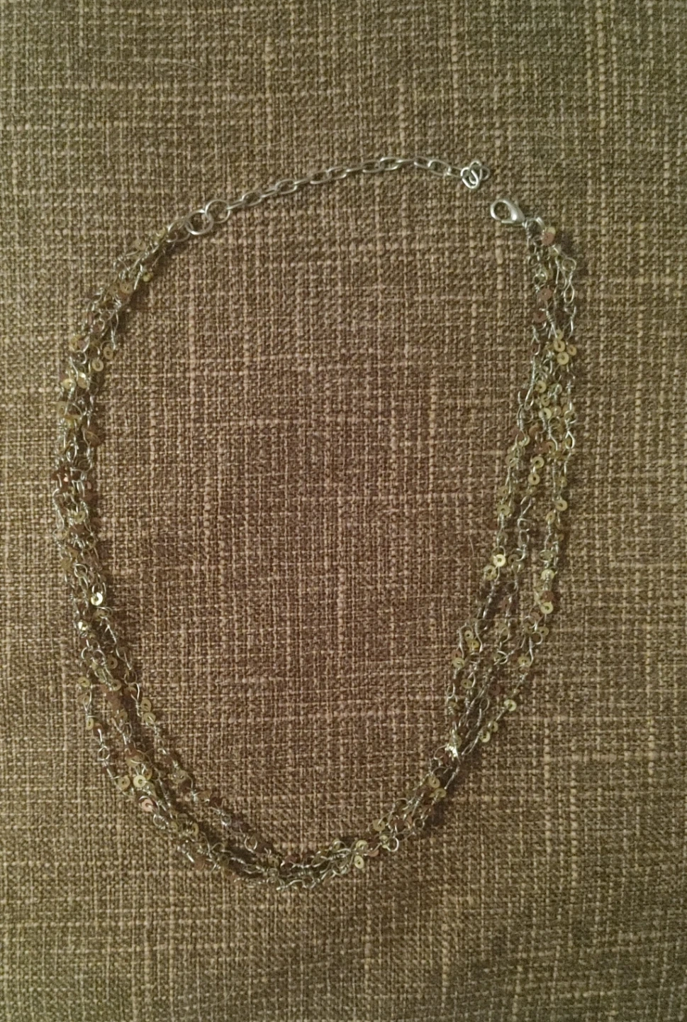 This is a silver-toned, multi-strand necklace with small, shimmering sequins. It features a delicate chain and a lobster clasp closure. It's a lovely accessory for adding a bit of sparkle!