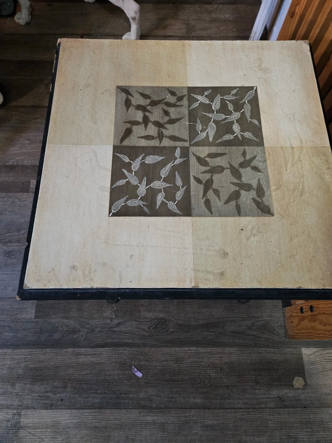 This square accent table features a decorative inlay on its top surface. It has a metal base with curved legs. Its compact size makes it suitable for small spaces.