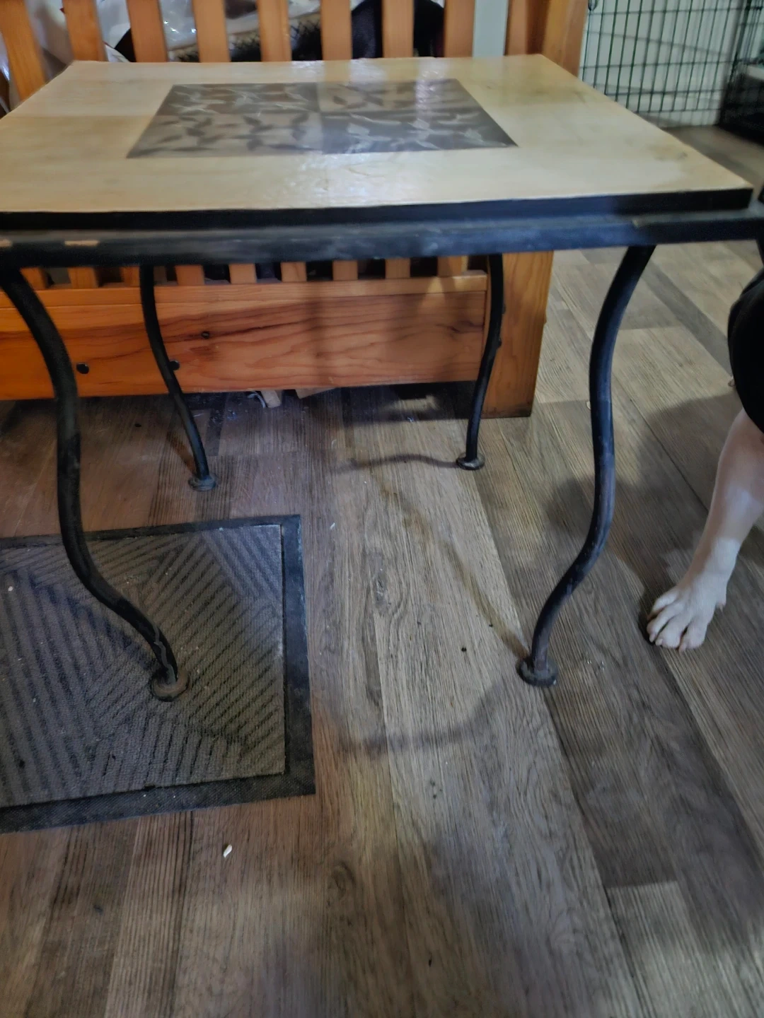 This square accent table features a decorative inlay on its top surface. It has a metal base with curved legs. Its compact size makes it suitable for small spaces.