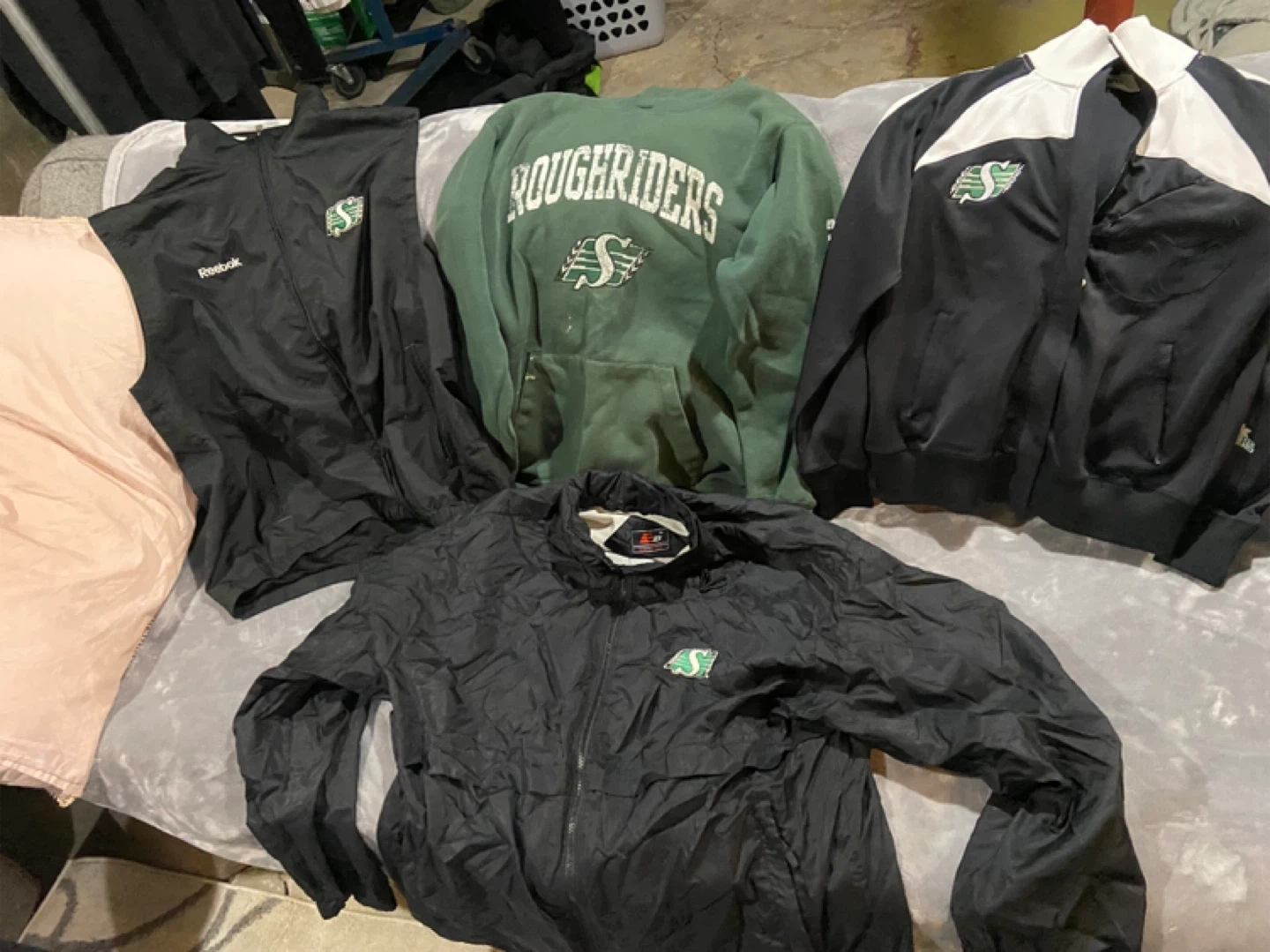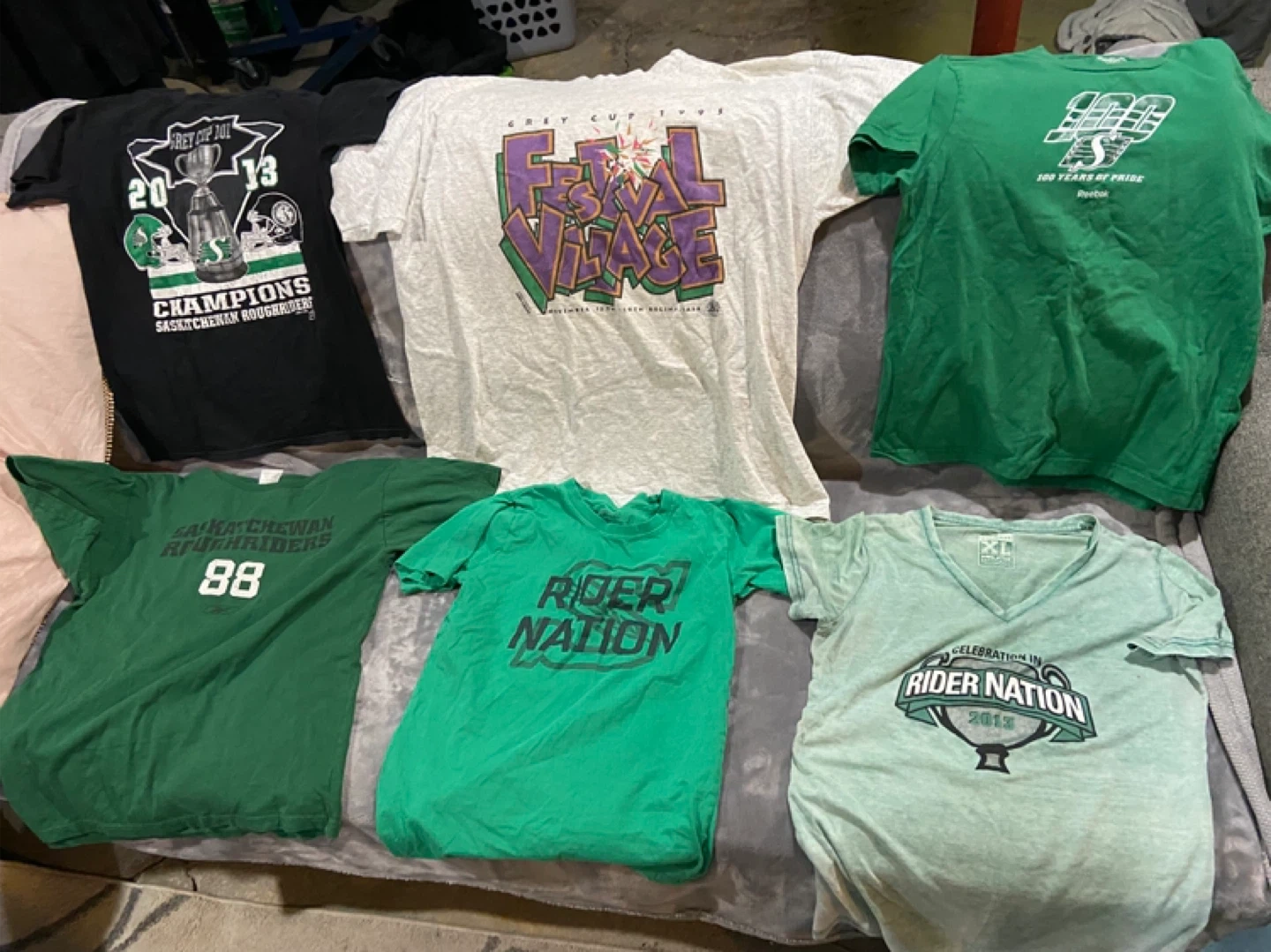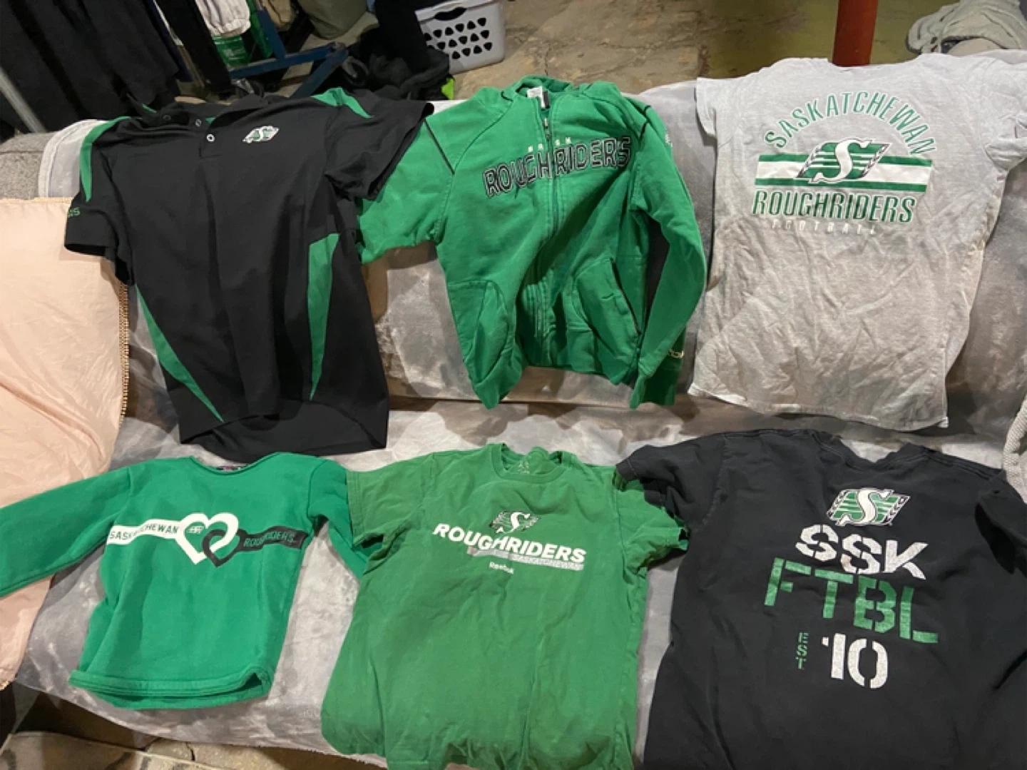 Bundle of assorted Saskatchewan Roughriders t-shirts and apparel. Includes various sizes and styles, perfect for any fan! Some shirts feature 'Roughriders' or 'Rider Nation' branding.