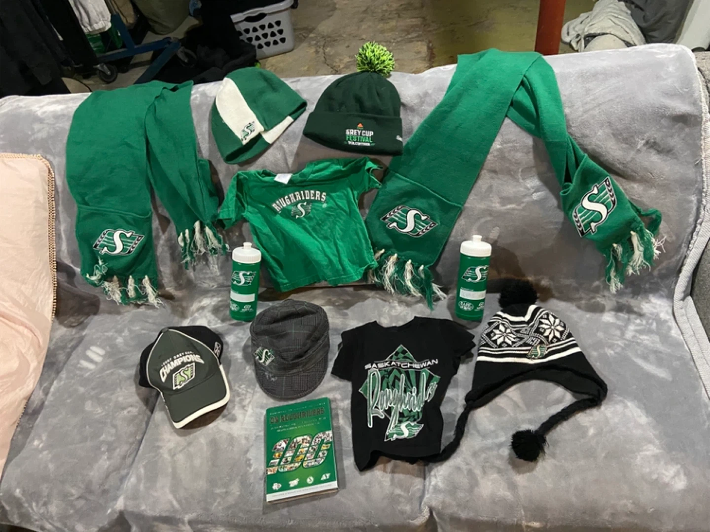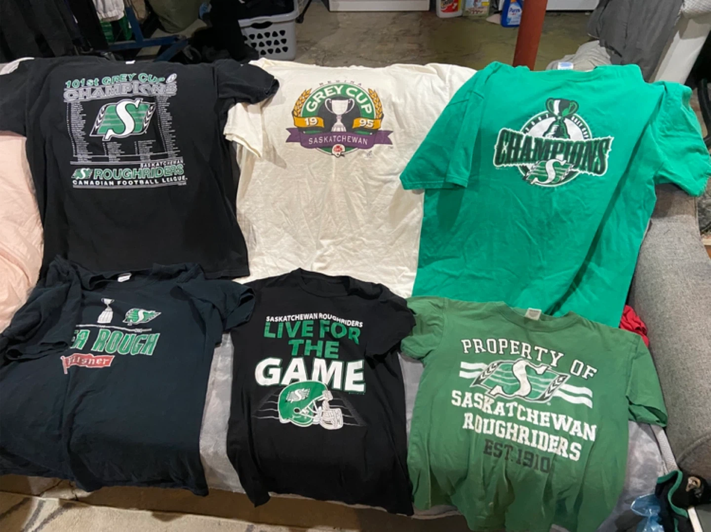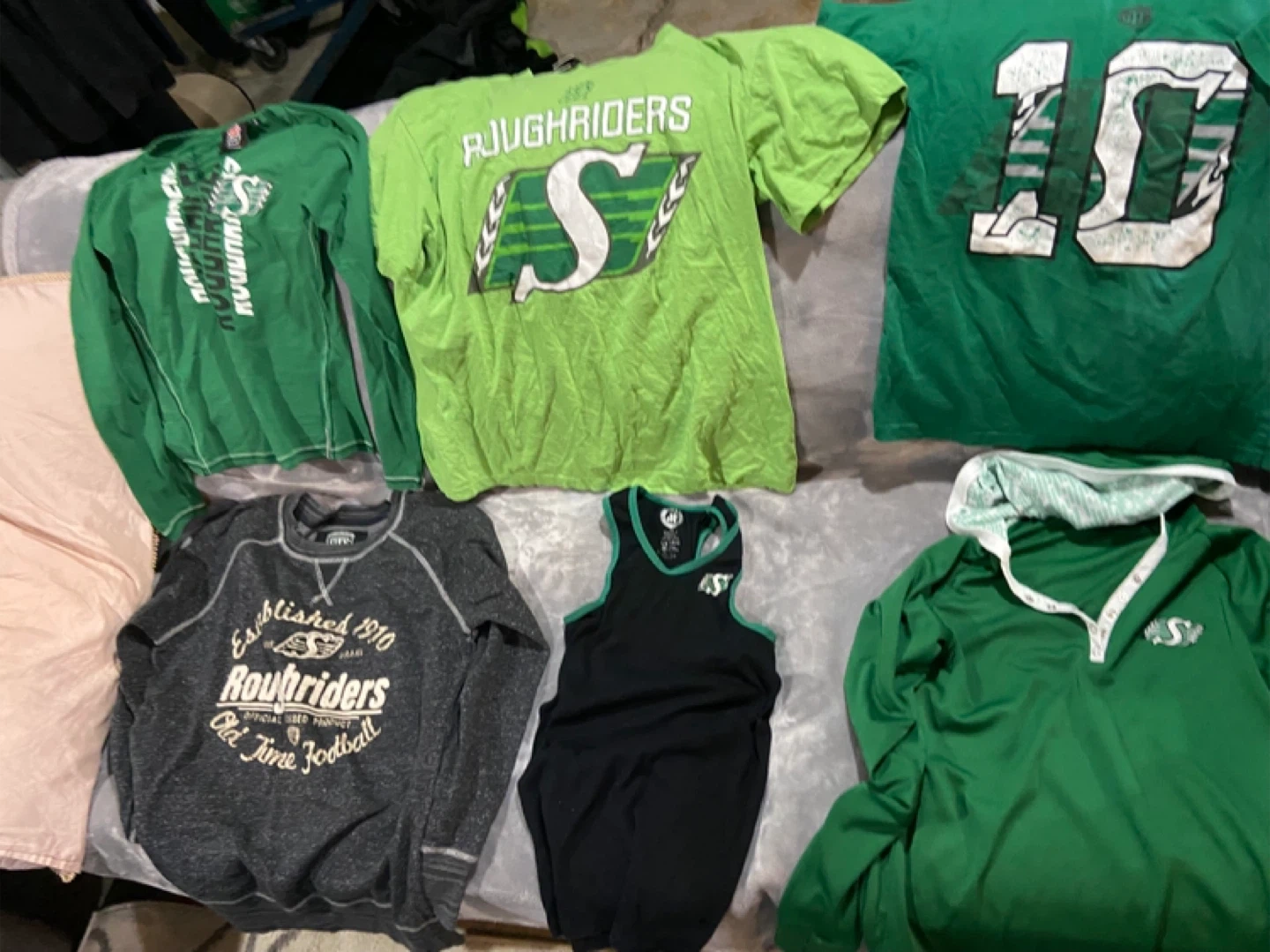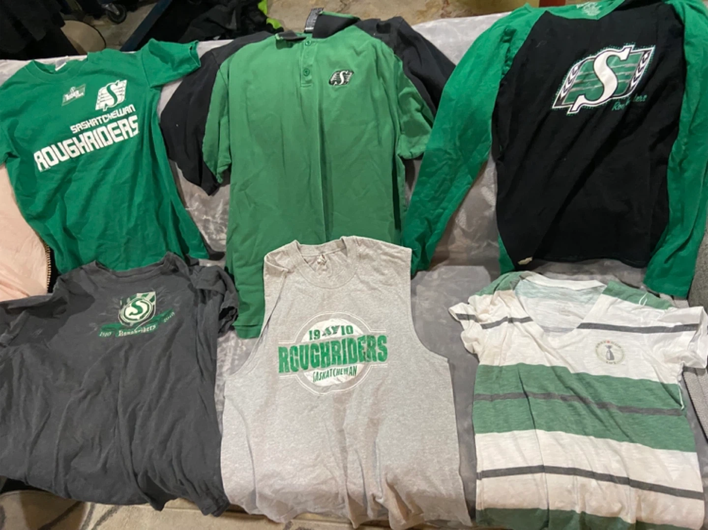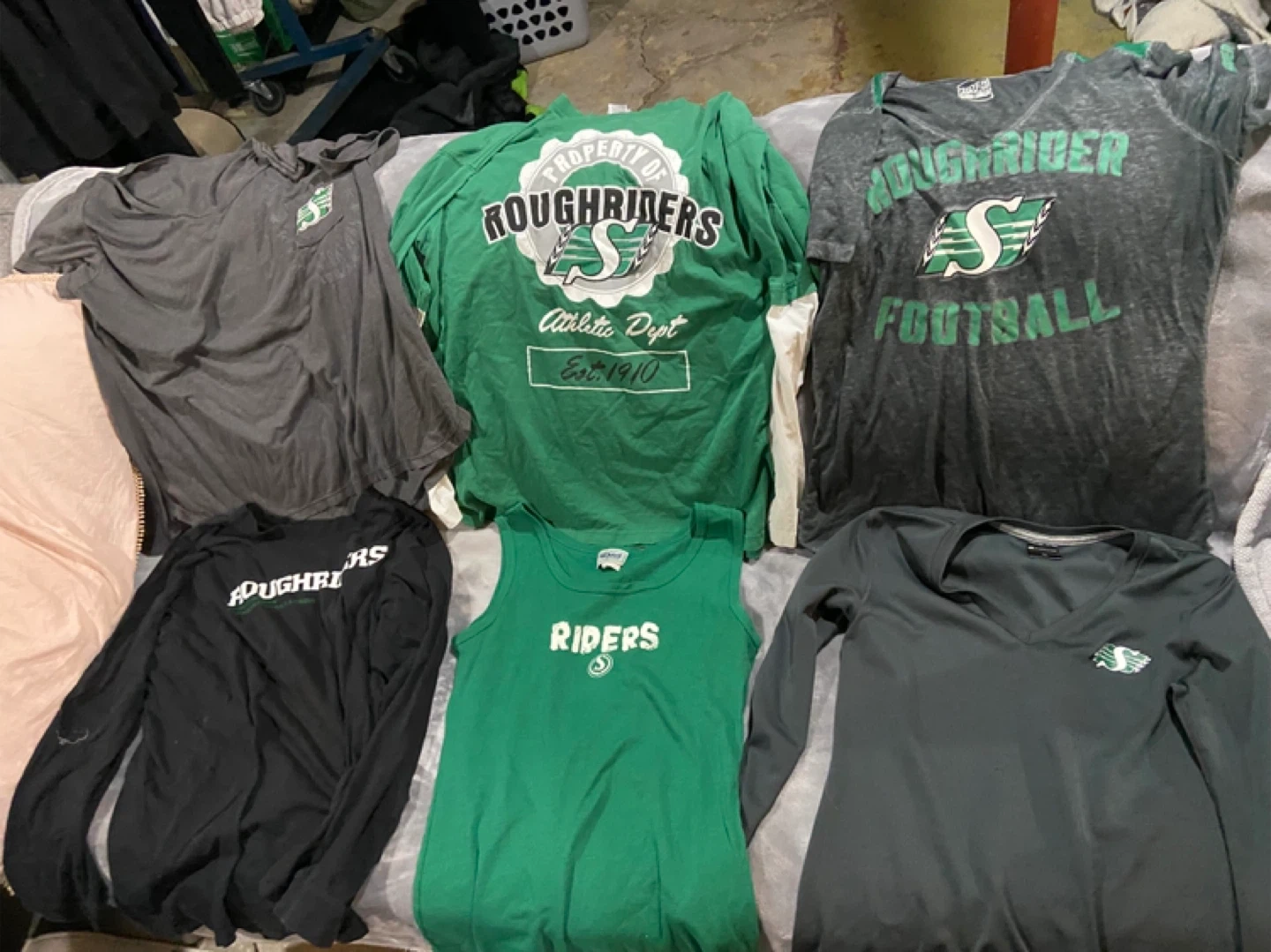 Bundle of assorted Saskatchewan Roughriders t-shirts and apparel. Includes various sizes and styles, perfect for any fan! Some shirts feature 'Roughriders' or 'Rider Nation' branding.