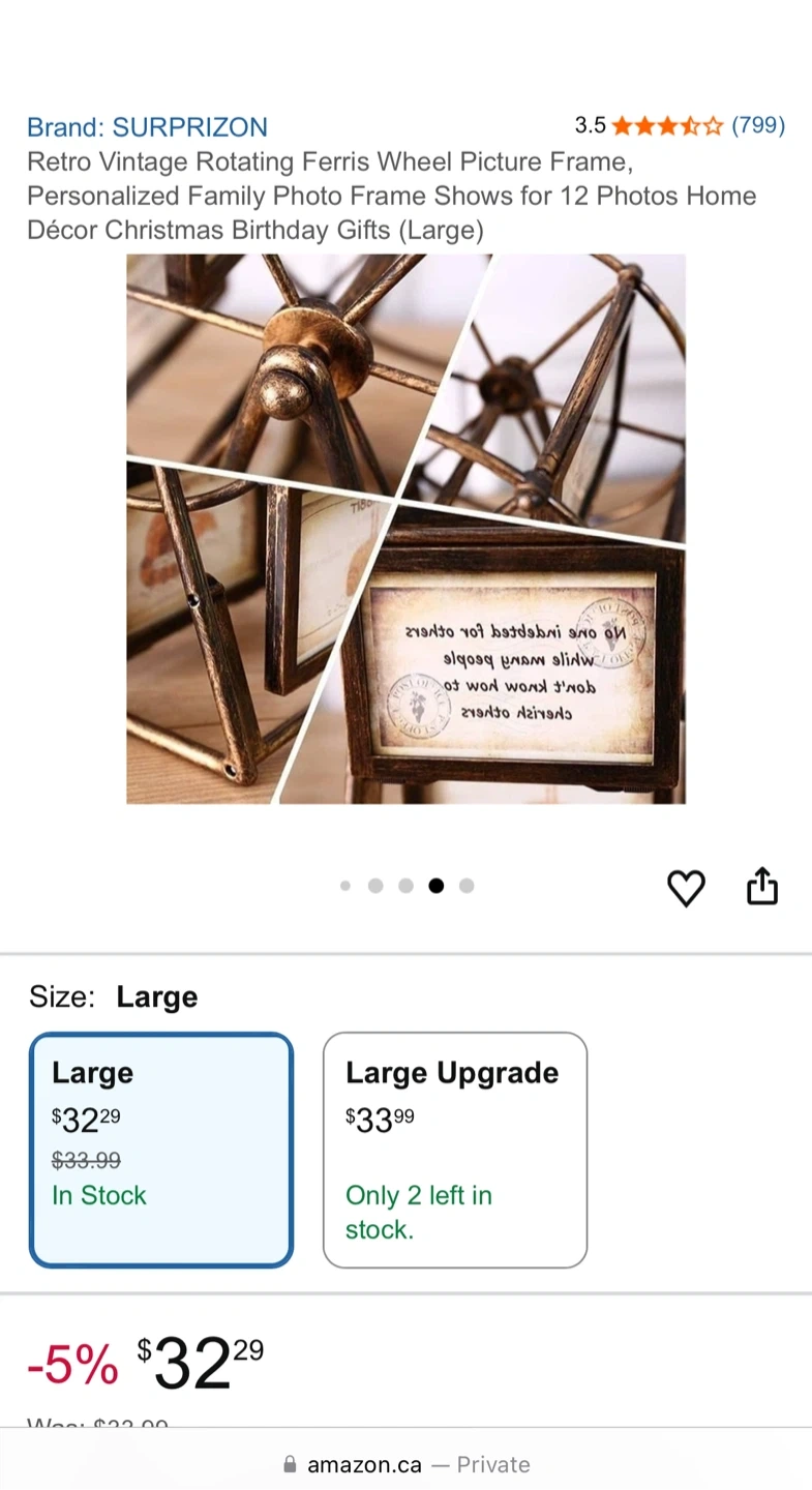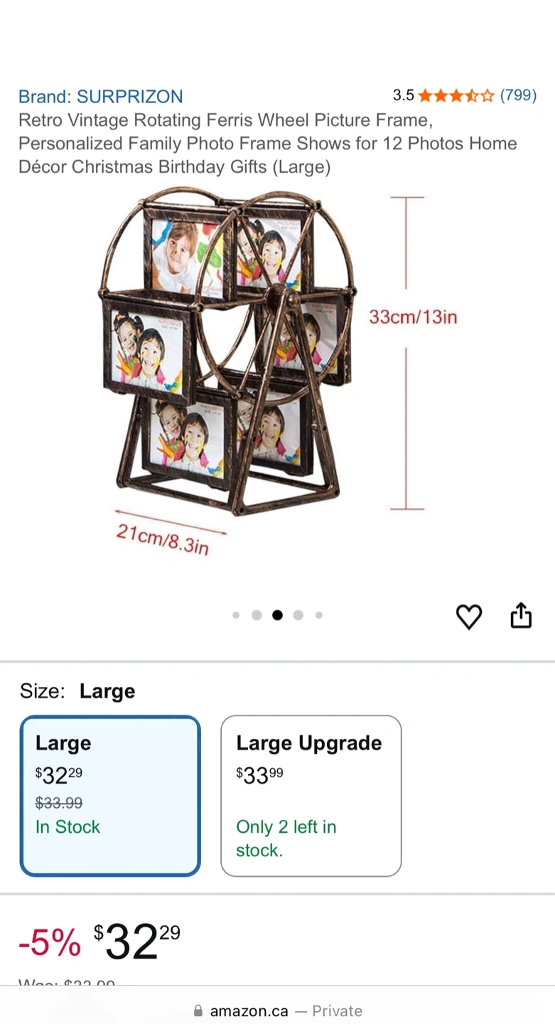 This SURPRIZON retro Ferris wheel picture frame holds 12 photos. It's made of metal with a vintage bronze finish. Dimensions are 21cm/8.3in wide and 33cm/13in tall. It displays family photos beautifully!
