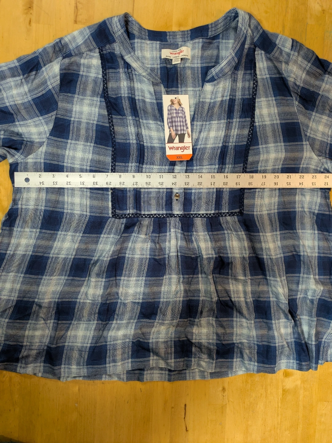 Check out this brand new Wrangler blouse! It's a beautiful blue plaid pattern and comes in size XXL. Perfect for adding a touch of classic style to your wardrobe. Never worn. 24" half bust