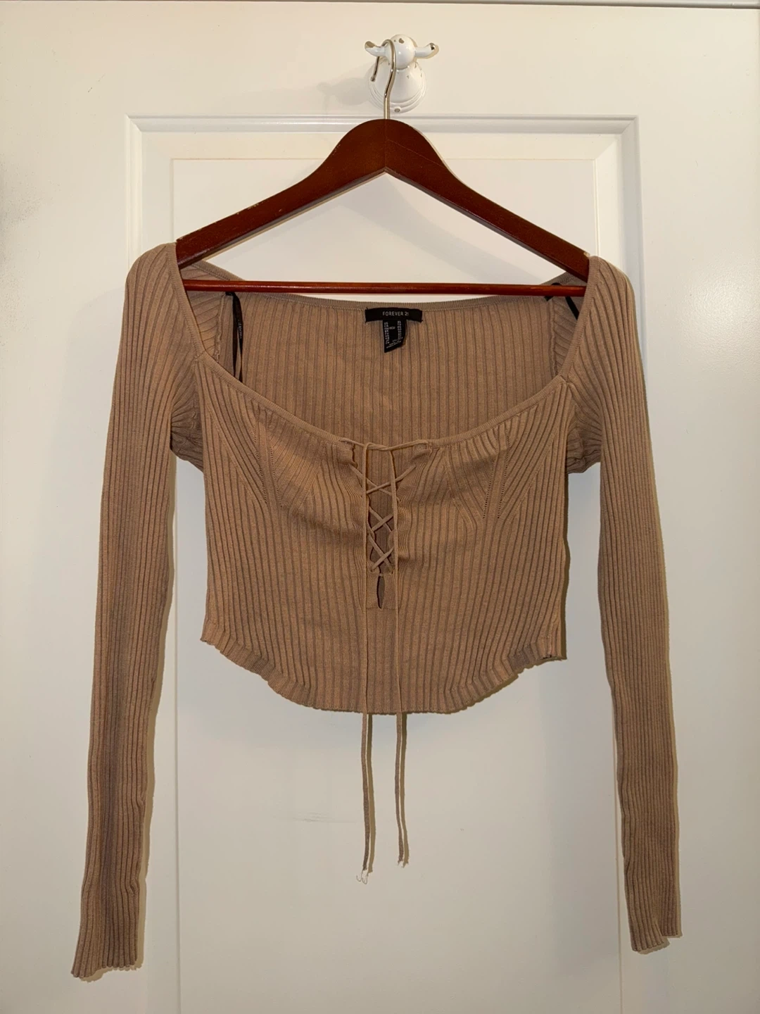 This is a tan, long-sleeved top from Forever 21. It features a lace-up front detail and a scoop neckline. The material is a stretchy and soft fabric.