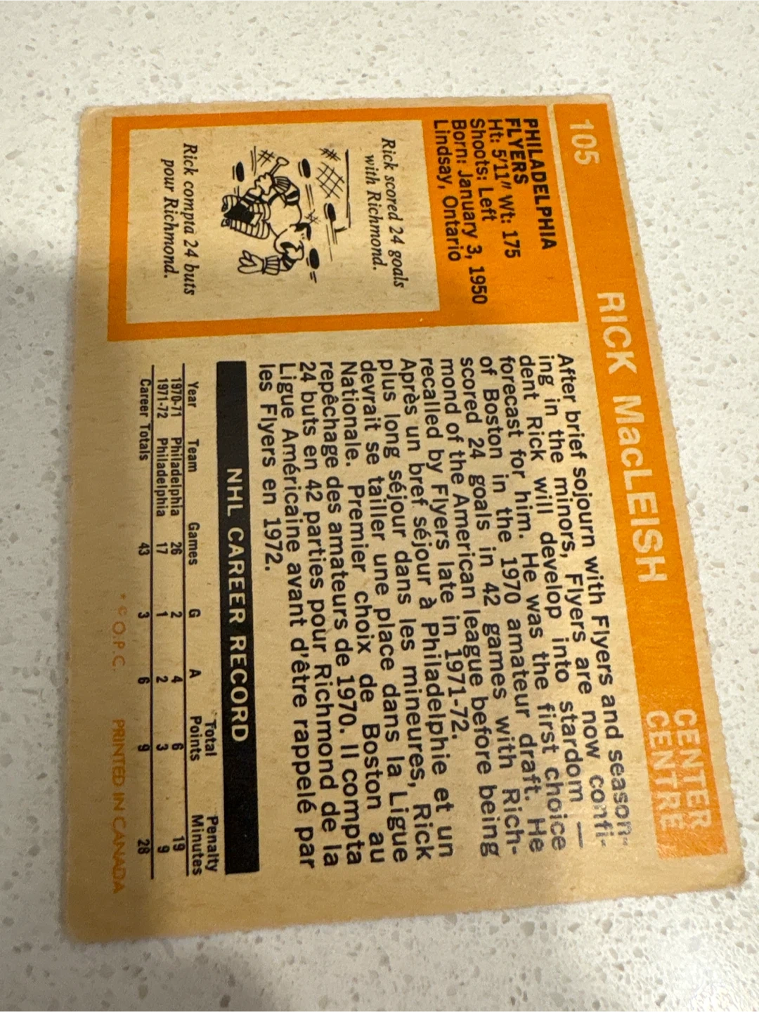 1970-71 Philadelphia Flyers Rick MacLeish hockey card. This card features Rick MacLeish, who scored 24 goals with Richmond. Printed in Canada.