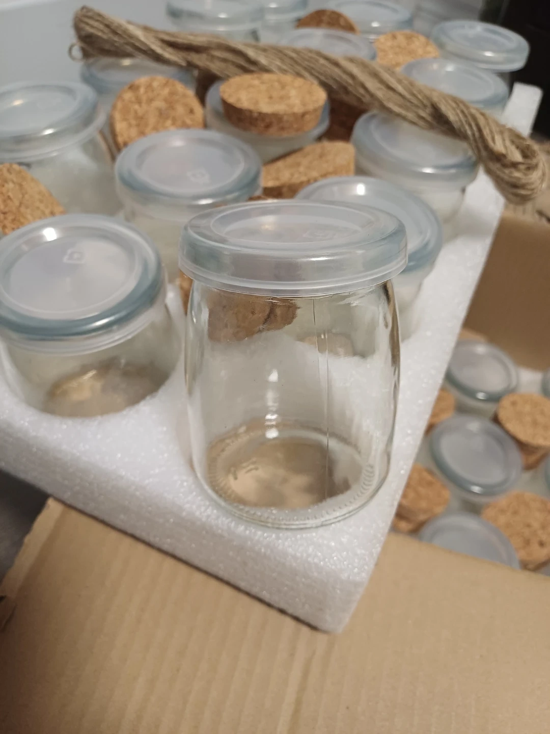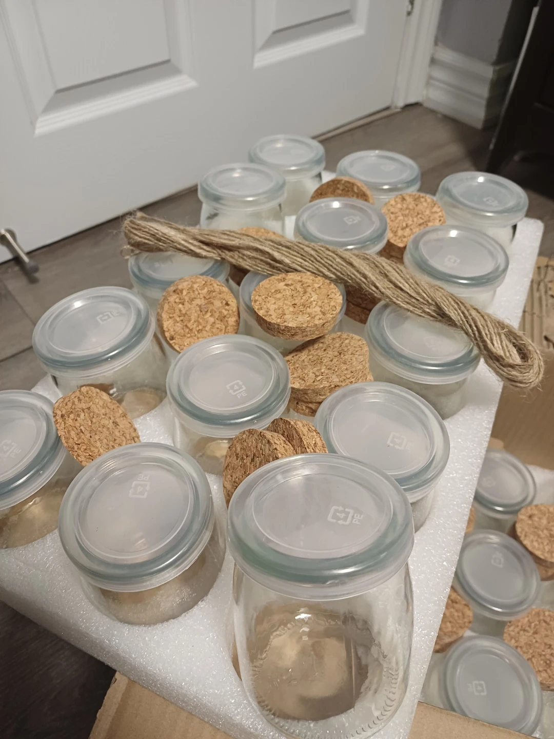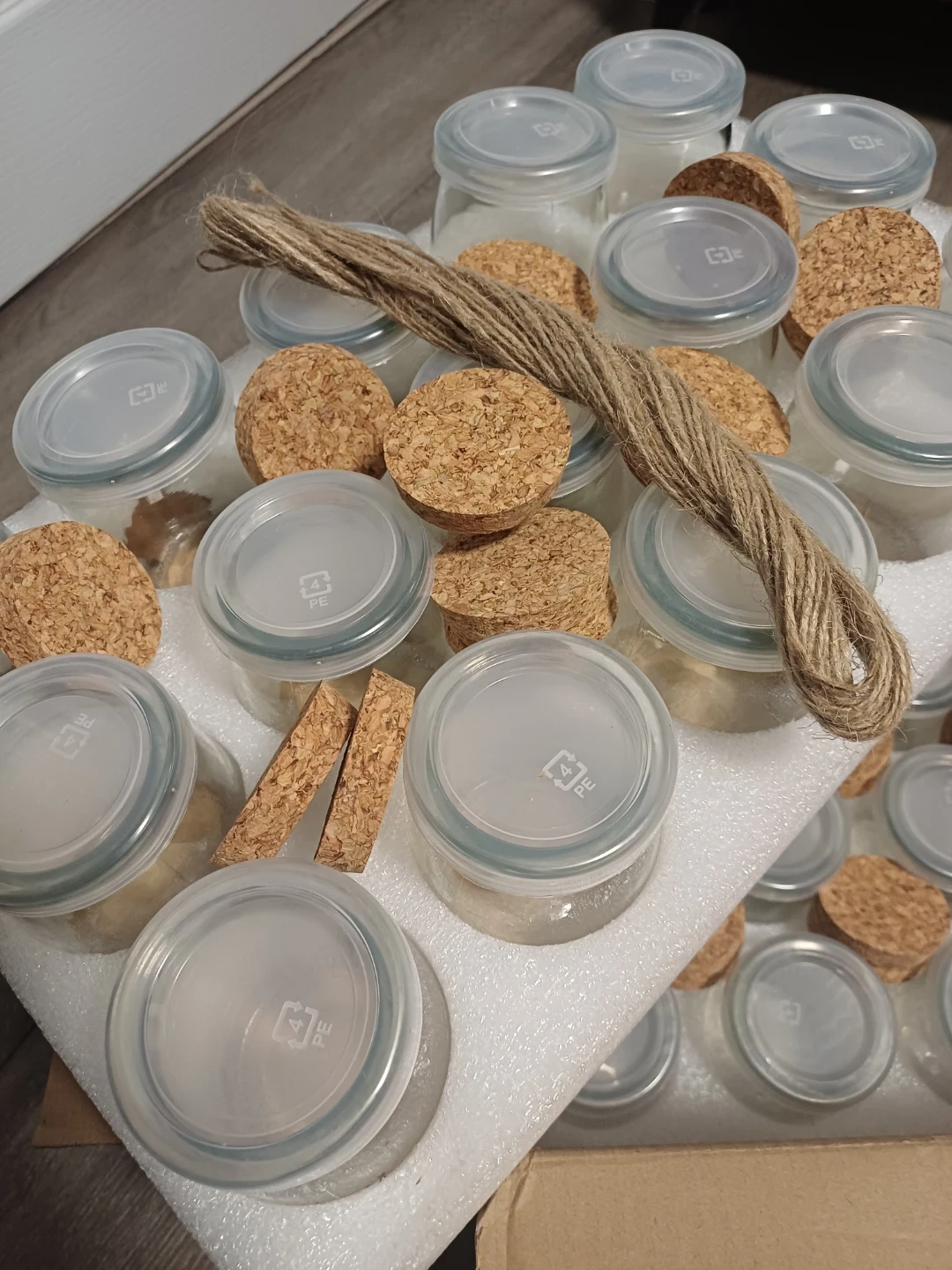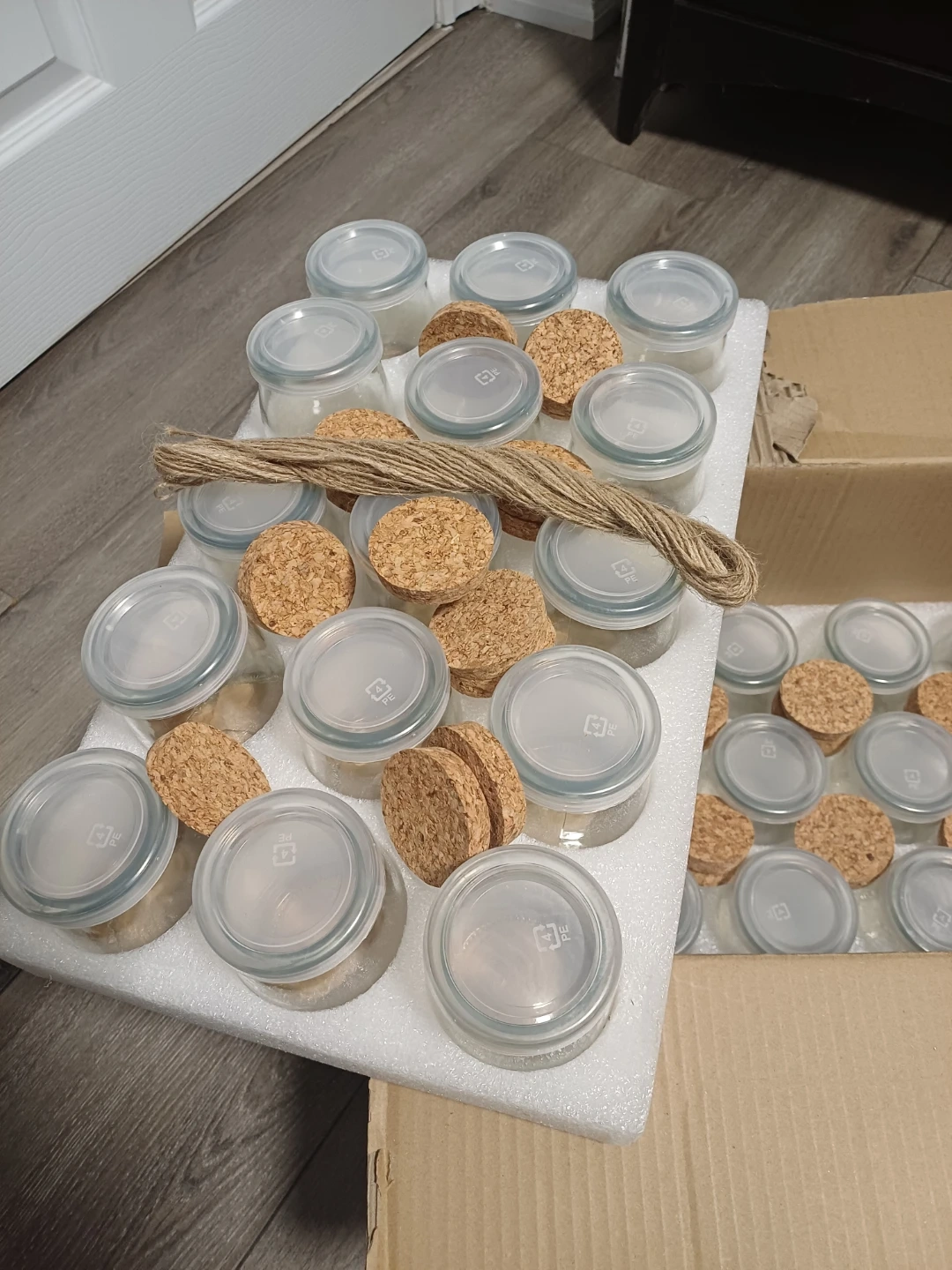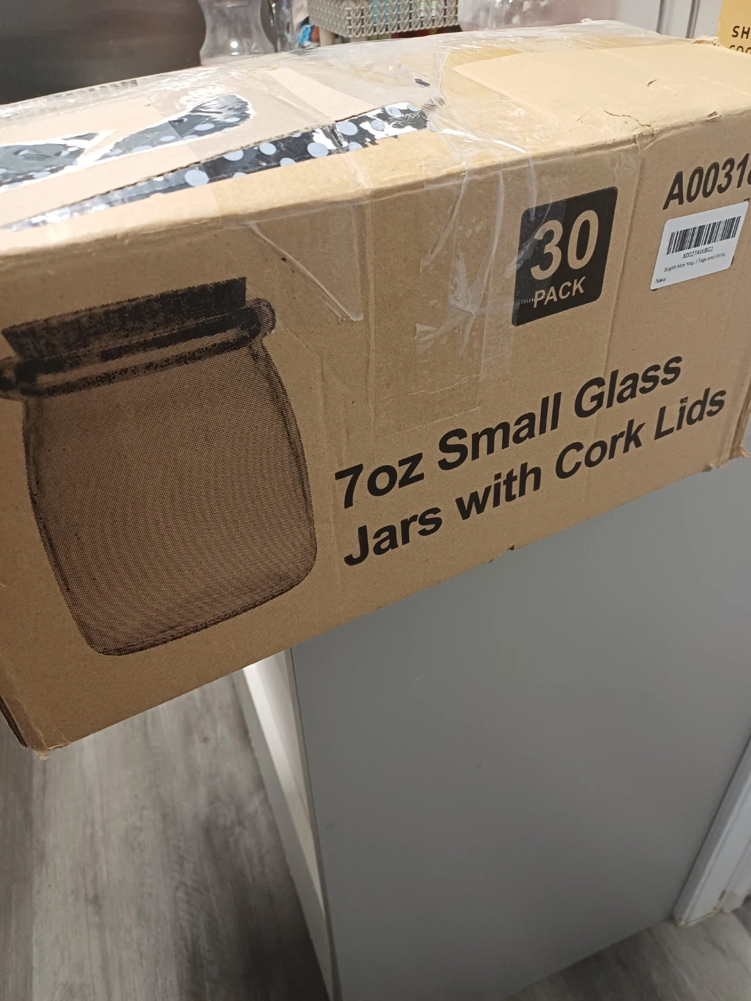 You'll get 30 little glass jars (7 oz) each with a cork lid. They're perfect for storing small items or for crafts. Jars are clear glass with a twist-on plastic lid and a natural cork stopper.
