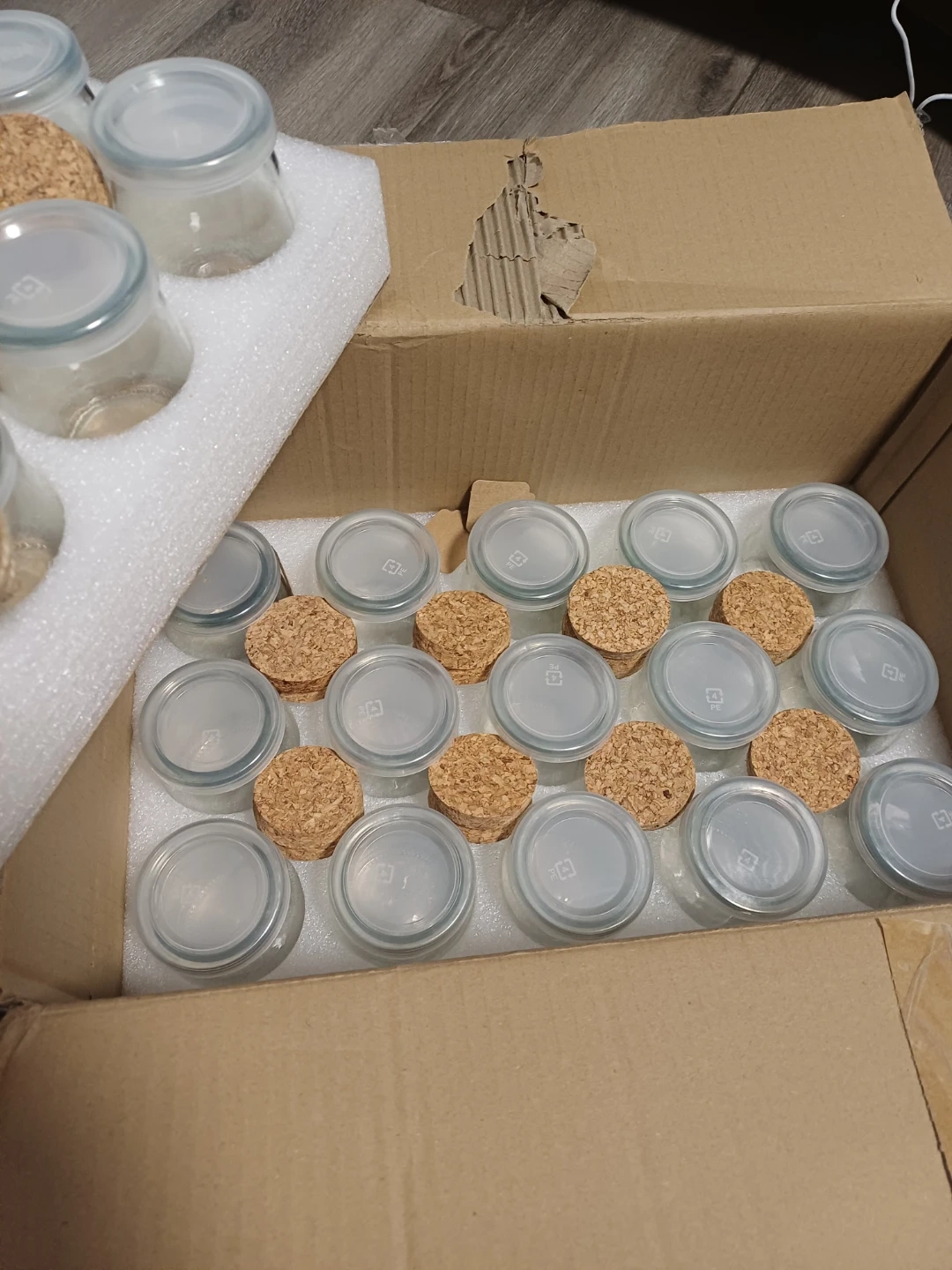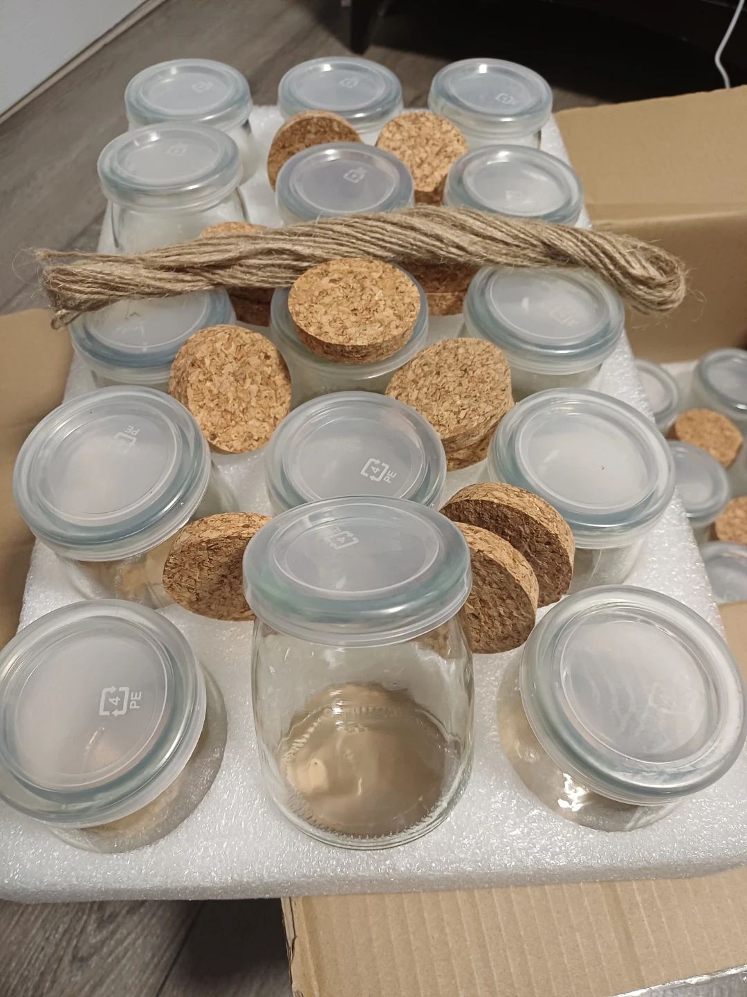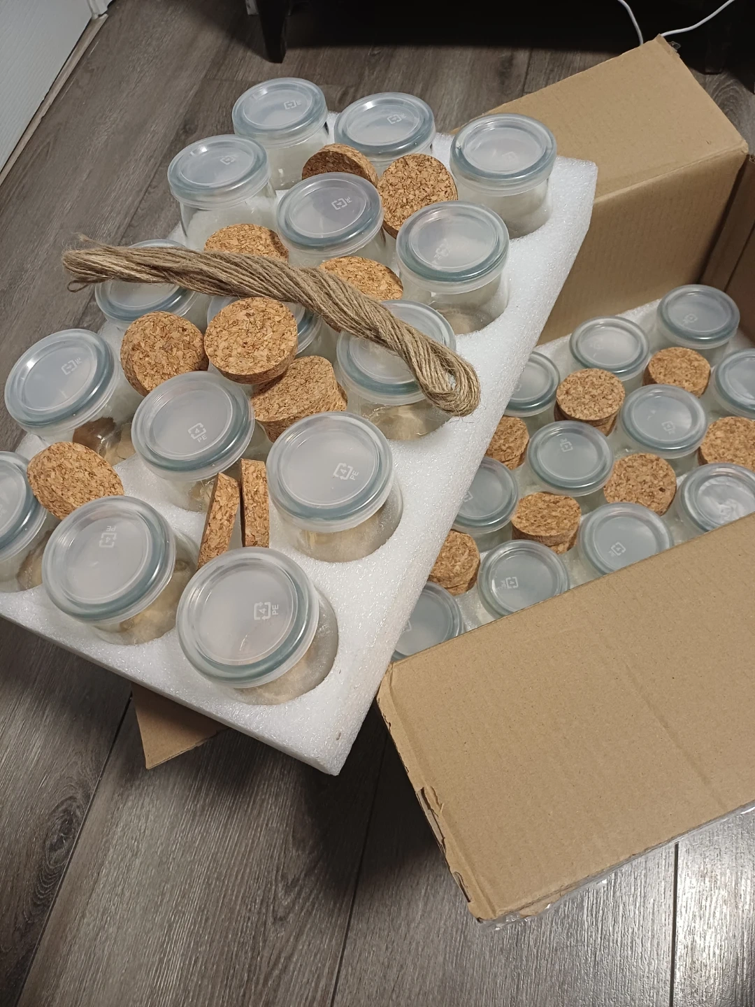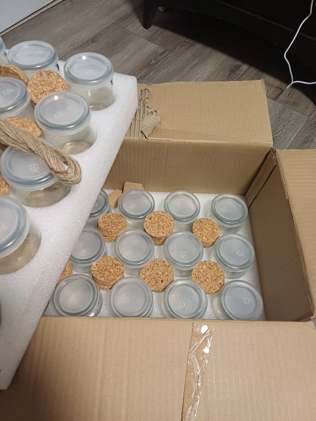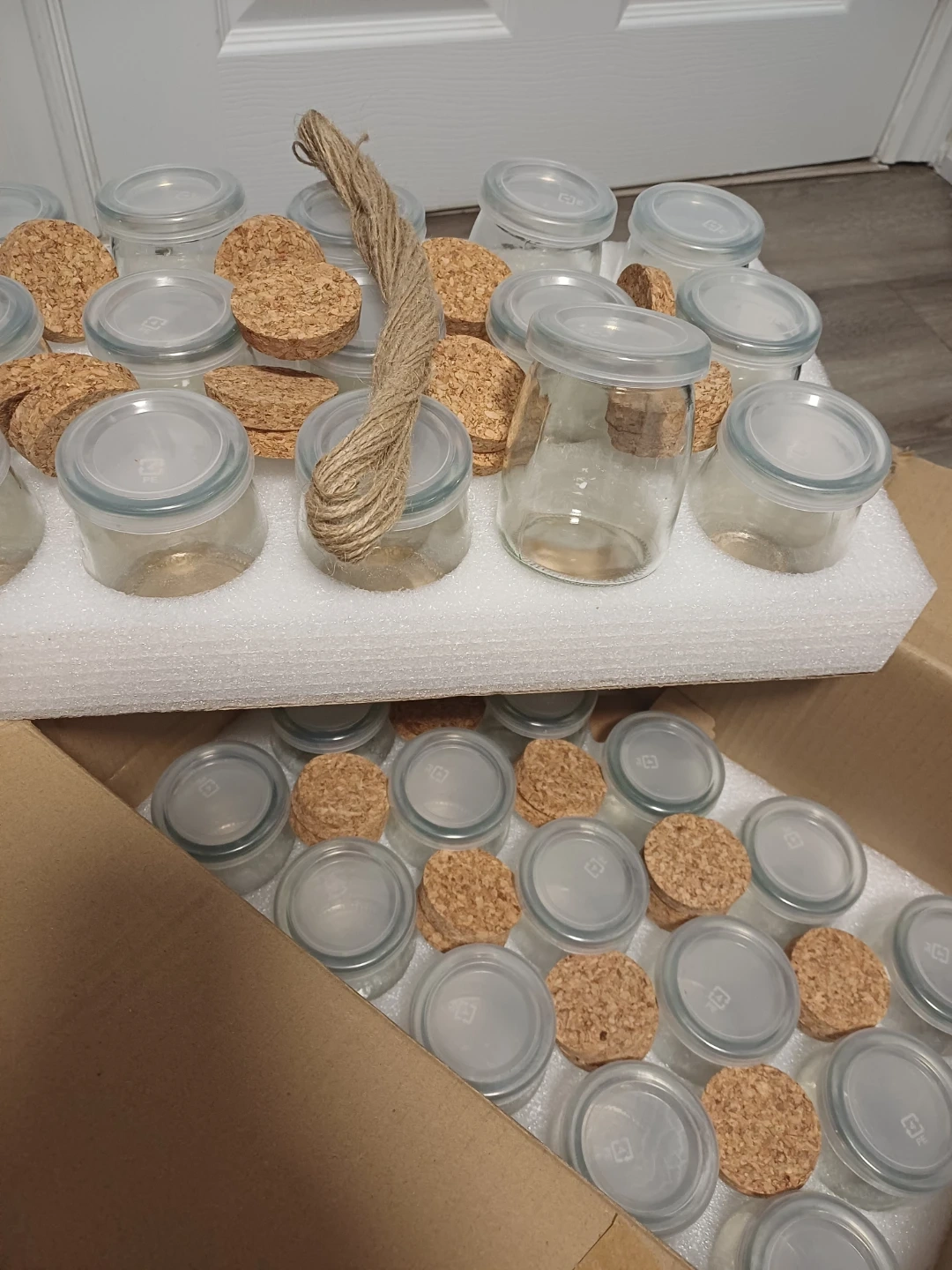 You'll get 30 little glass jars (7 oz) each with a cork lid. They're perfect for storing small items or for crafts. Jars are clear glass with a twist-on plastic lid and a natural cork stopper.