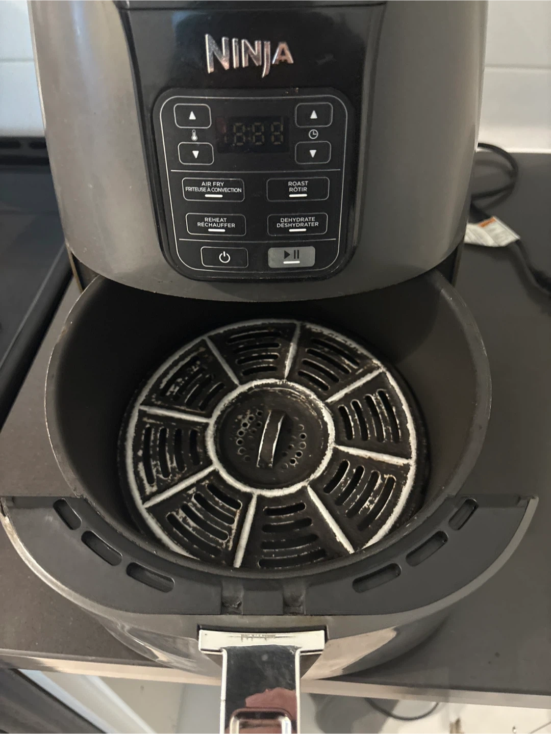 This is a Ninja air fryer. It has multiple functions including air fry, roast, and dehydrate. The basket and crisper plate are removable for easy cleaning.