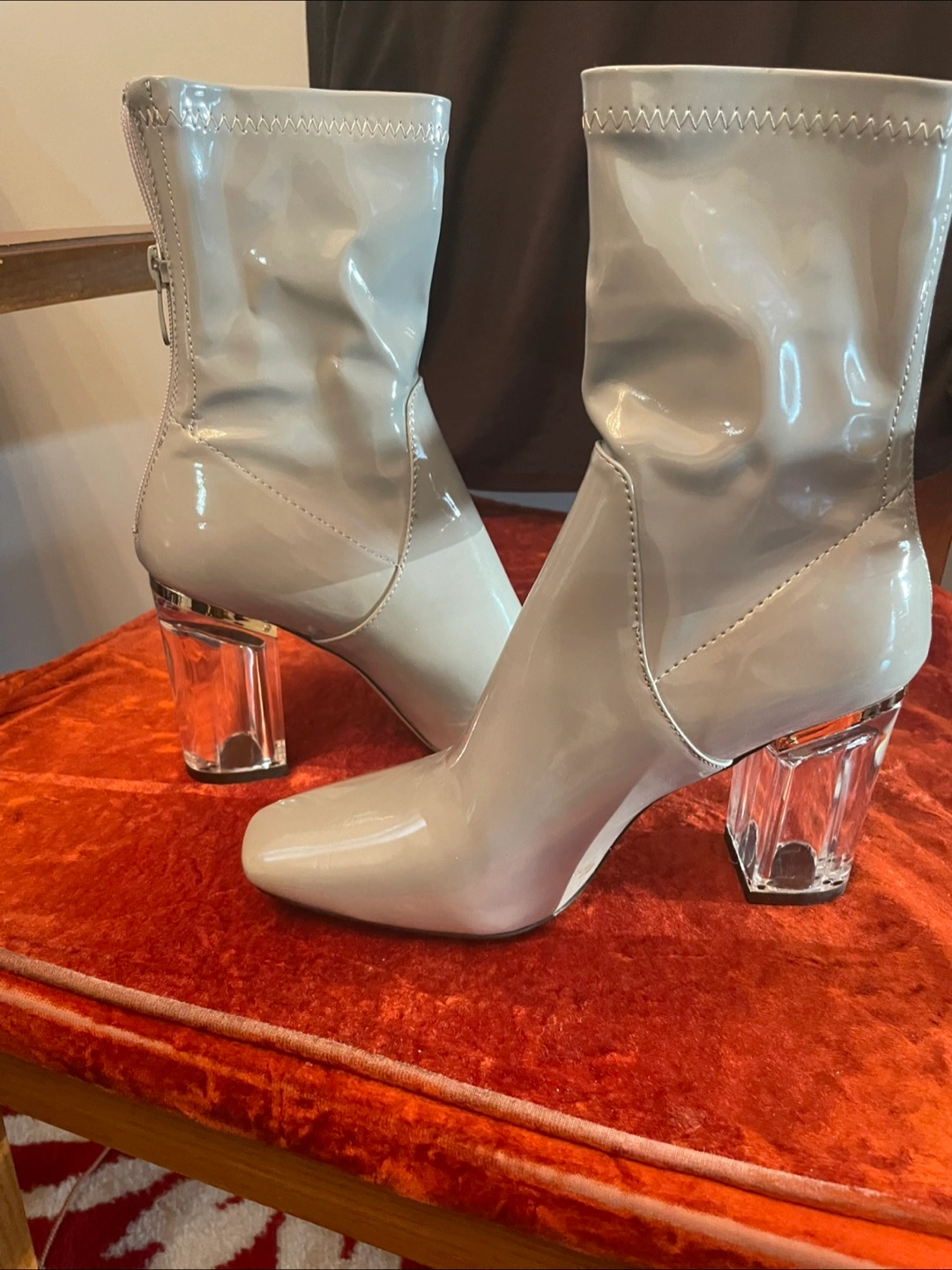 Acado light grey ankle boots feature a unique clear heel design. They're in good condition and ready for a new home! They would make a great addition to your wardrobe for a night out or a special occasion.