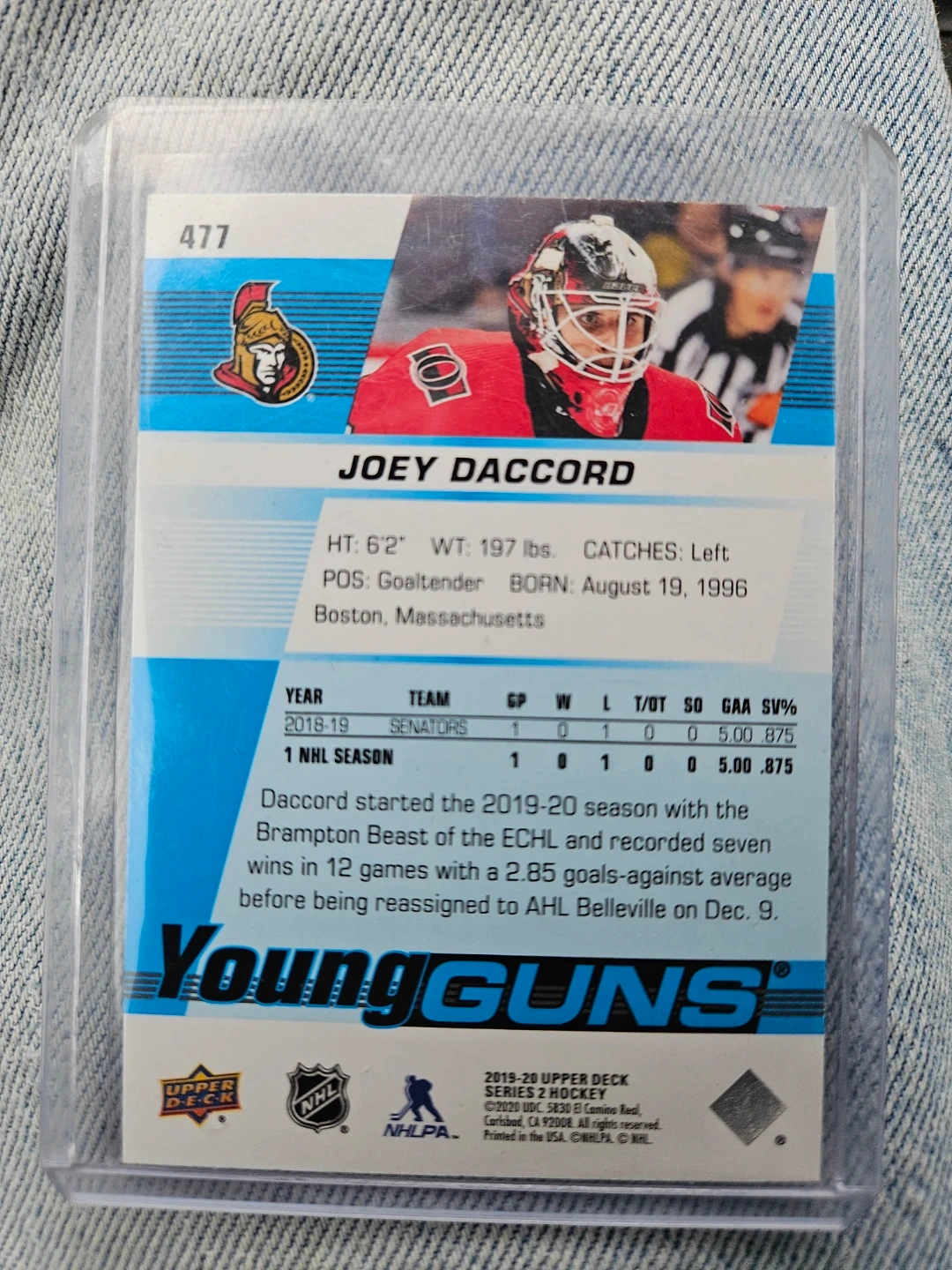 Selling a Joey Daccord Upper Deck Young Guns hockey card! This card features Daccord in his Senators gear. It's in great condition and would be a fantastic addition to any hockey card collection