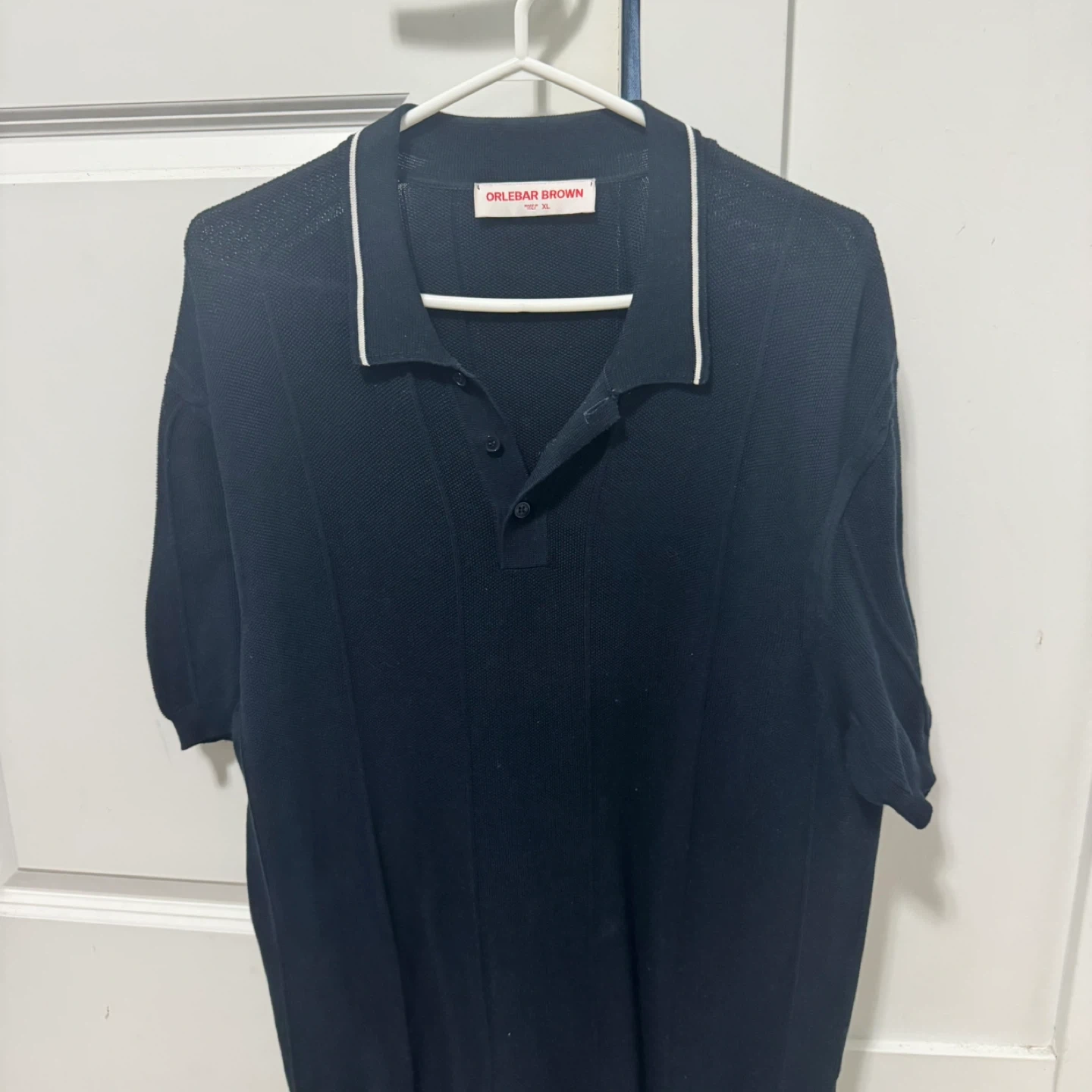 Orlebar Brown knit polo shirt in navy. Made in Italy, 100% cotton. Features a classic collar and button placket. Size XL.