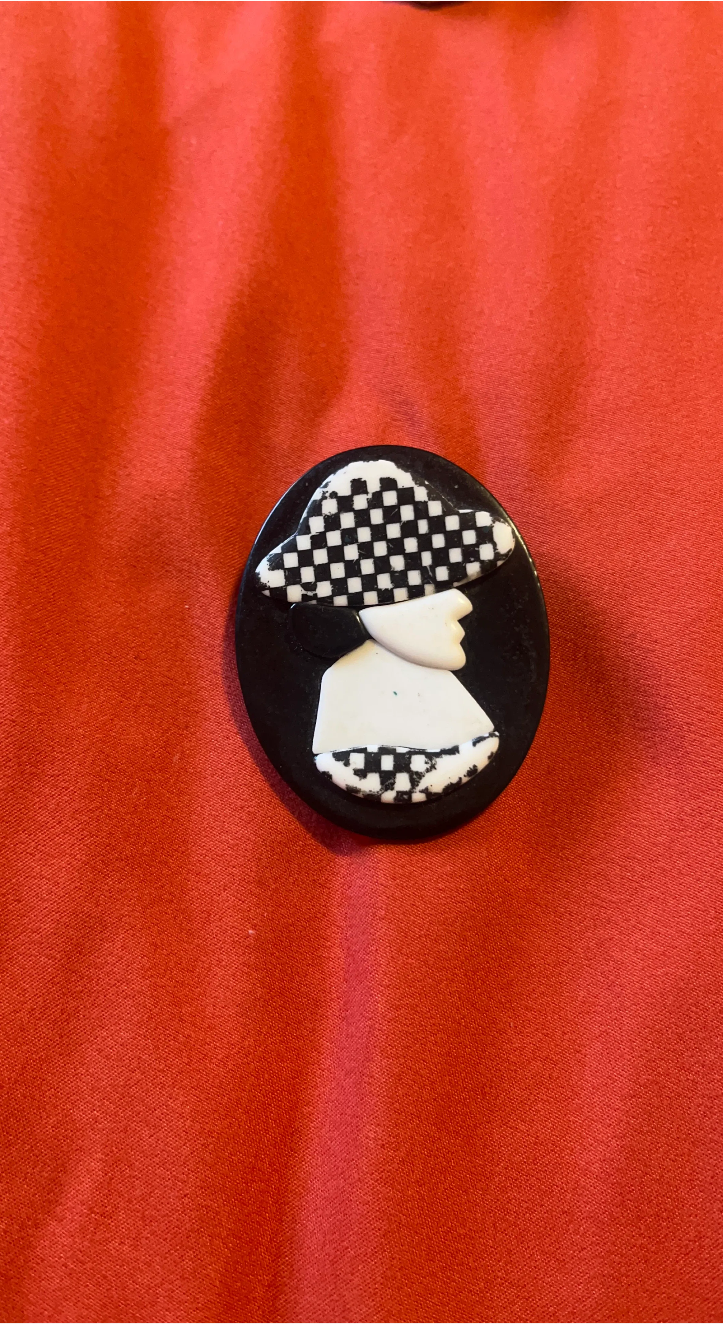 This unique brooch features a black silhouette with a checkered hat and collar. It's a fun accessory for any outfit! The brooch is made of plastic and has a secure pin backing.