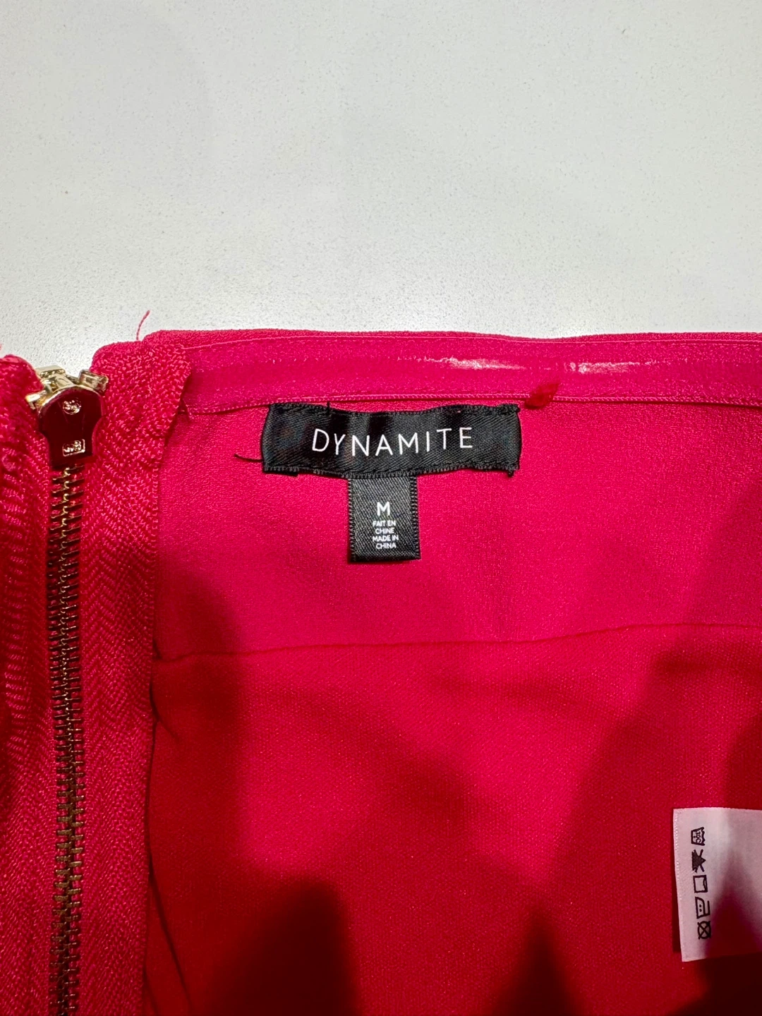 This Dynamite strapless corset top is a vibrant hot pink colour. It's a size medium with a front zipper closure. This top's structured design makes it a stylish addition to any outfit!