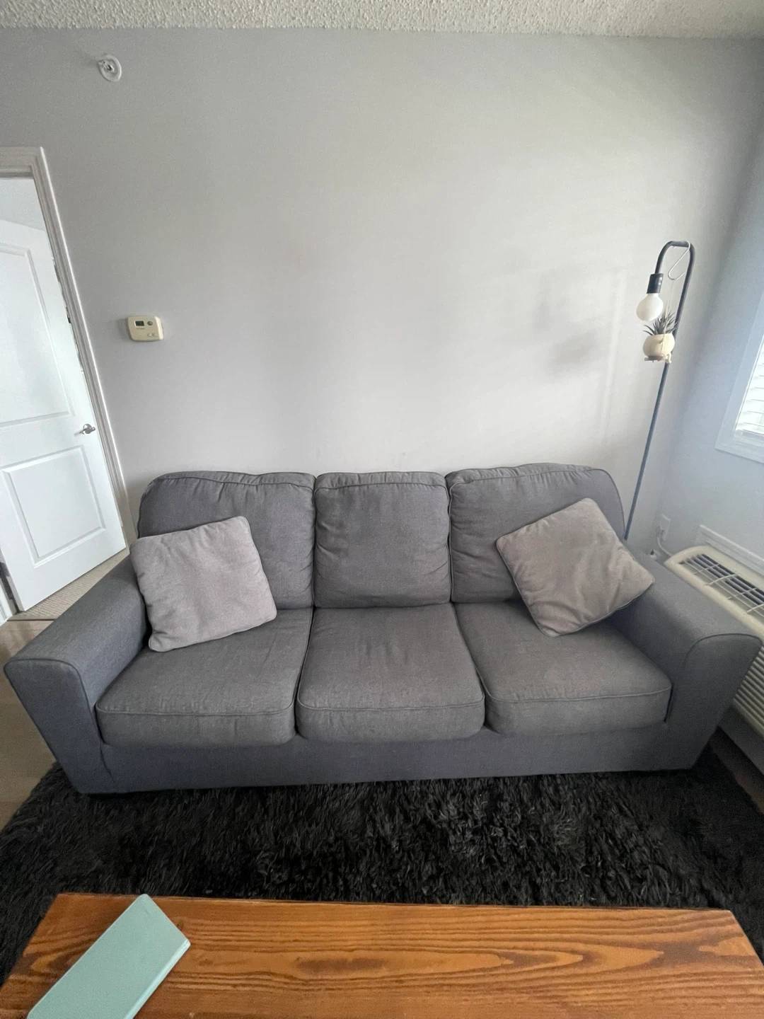Comfortable grey sofa bed with three seat cushions. Upholstered in a durable fabric